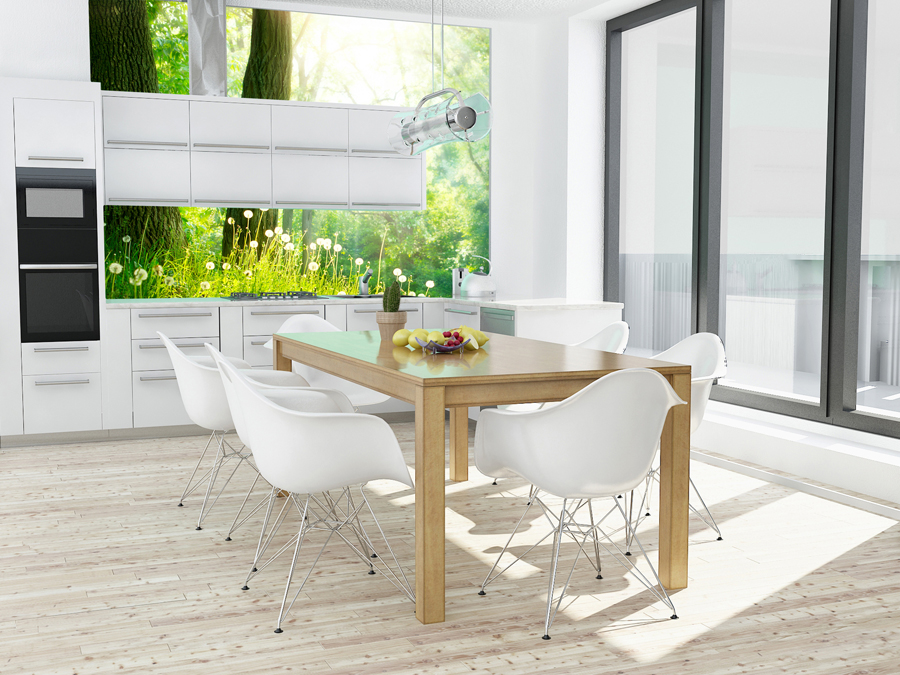 W przestrzeni pomiędzy szafkami i nad kuchenką zazwyczaj kładzione są płytki ceramiczne, bo znacznie łatwiej utrzymać je w czystości niż ściany pokryte tylko farbą. Ale z powodzeniem można je zastąpić fototapetą. Nad blat roboczy najbardziej praktycznym rozwiązaniem są fototapety pod szkło, czyli fototapeta przyklejona do szkła „od spodu” i zalaminowana.
