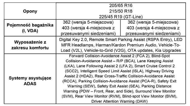 Wygodę zwiększa pełna integracja z aplikacją Kia App, cyfrowy kluczyk wykorzystujący technologie NFC oraz systemy Bluetooth i Ultra-Wideband, a także aktualizacje OTA oraz funkcje dostępne na żądanie (Features on Demand). Opcjonalny system audio Harman/Kardon z ośmioma głośnikami dodatkowo podnosi komfort podróżowania.