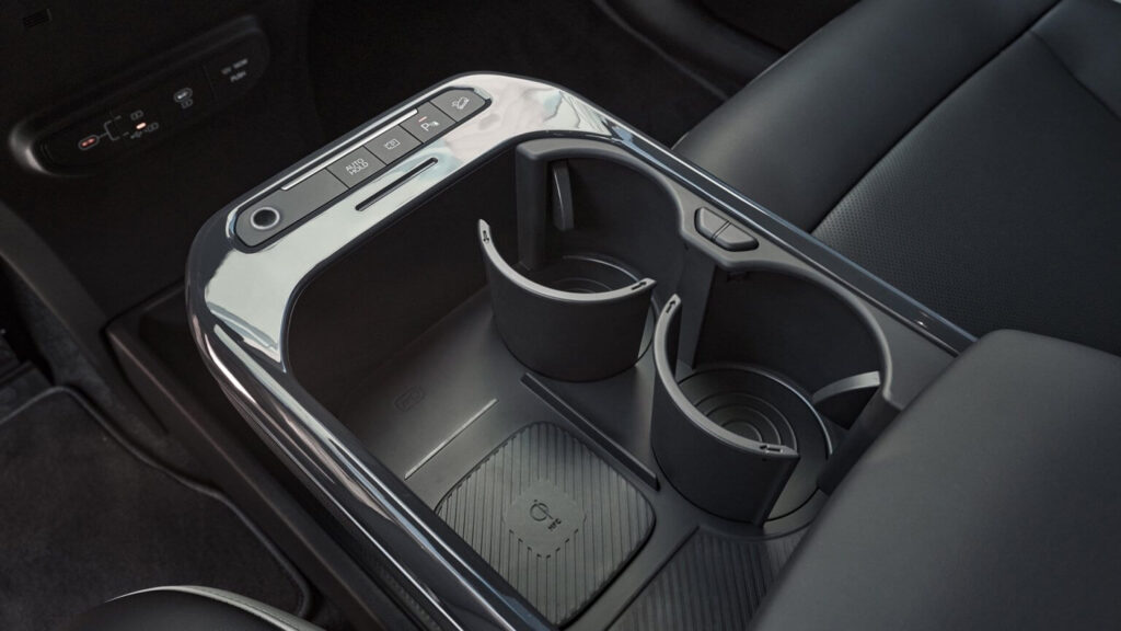 Z przodu uczucie przestronności jest jeszcze większe, a to za sprawą horyzontalnie zaprojektowanej deski rozdzielczej z trzema ekranami ukrytymi za jedną taflą szkła oraz wiszącej konsoli środkowej. Przed nią znalazło się miejsce na torebkę czy plecak (jest nawet haczyk do ich powieszenia), dwa porty USB-C (trzeba do nich sięgnąć dość głęboko) i gniazdo zapalniczki 12V. Zamykany schowek w podłokietniku nie jest zbyt głęboki (z racji na wysuwaną szufladę z tyłu), ale wystarczający na parę drobiazgów. Za to wnęka przed nim zaprojektowana została bardzo praktycznie. Ma wysuwane uchwyty na kubki i ładowarkę indukcyjną w idealnym miejscu. Telefon łatwo włożyć, wyjąć, a nawet kliknąć coś na nim (np. na postoju) bez konieczności brania go do ręki.