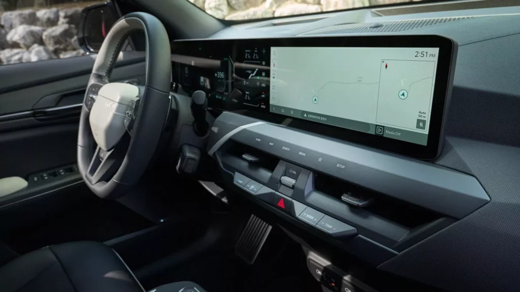 Wyświetlacz dedykowany temperaturze i nawiewom jest świetnym pomysłem, jednak w praktyce jego część bywa przesłonięta przez wieniec kierownicy. Aby sprawdzić ustawienia trzeba delikatnie wychylić głowę. Deska rozdzielcza, podłokietnik oraz tapicerka foteli są wykonane na najwyższym poziomie. Jednak w dolnych partiach kabiny i na boczkach drzwi znajdziemy twardsze plastiki. EV5 czy Sportage – gdzie jest bardziej „premium”? Porównując te dwa modele w wersjach GT-Line, klasyczny Sportage sprawia wrażenie nieco bardziej przytulnego i luksusowego.