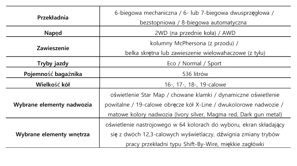 • 1.6 T-GDI (o wysokiej mocy) – 193 KM i 265 Nm – współpracujący z 8-biegową przekładnią automatyczną