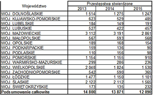 Z zestawienia przekazanego naszej redakcji przez Wiolettę Szubską z Wydziału Prasowo-Informacyjnego Biura Komunikacji Społecznej Komendy Głównej Policji wynika, że w ciągu ostatnich 3 lat odnotowano znaczący spadek kradzieży aut. A Podkarpacie jest w tym zestawieniu swoistym ewenementem. Być może tak mała liczba kradzieży aut w woj. podkarpackim związana jest z sytuacją materialną jego mieszkańców. Na najdroższe, luksusowe limuzyny stać małą grupę ludzi. A właśnie auta z tej półki są w polu zainteresowania amatorów cudzego mienia.