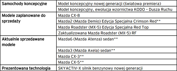 Na Targach Motoryzacyjnych Tokio 2017 Mazda Motor Corporation zaprezentuje dwa samochody koncepcyjne: jeden z nich jest zapowiedzią nowej generacji produktów, a drugi wskazuje kierunek stylistyczny przyszłych modeli marki. Kolejną atrakcją stoiska Mazdy będzie ekspozycja technologii, czyli model silnika benzynowego SKYACTIV-X. Targi będą otwarte dla publiczności od 28 października do 5 listopada, po dniach prasowych zaplanowanych na 25 i 26 października.