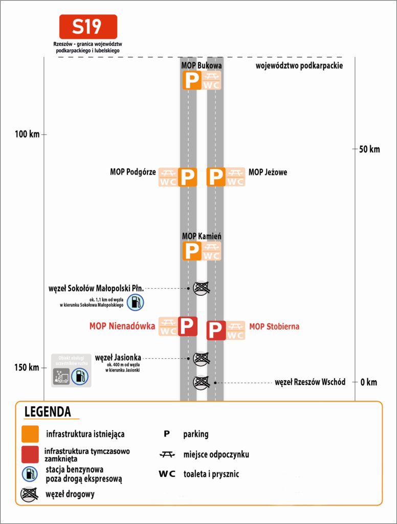 Przypominamy, że w związku z rozbudową odcinka S19 Sokołów Małopolski Północ – Jasionka, od grudnia ubiegłego roku zamknięty jest także MOP Nienadówka przy S19 (kierunek Rzeszów). Wynika to z charakteru prowadzonych przez wykonawcę prac, które na całym rozbudowywanym odcinku realizowane są pod ruchem.