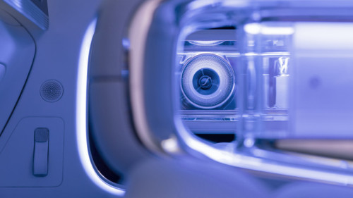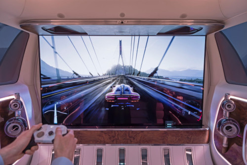 Dzięki rozdzielczości 4K ekran kinowy wyświetla wideo i gry z wyjątkową przejrzystością i szczegółowością. System dźwięku przestrzennego z Dolby Atmos zapewnia doskonałe brzmienie muzyki. Oferuje łącznie 42 głośniki, w tym tzw. wzbudniki w siedzeniach, które zamieniają dźwięk w doświadczenie fizyczne. Siedem projektorów w podsufitce i podłodze rozszerza pole widzenia. Boczne okna stają się dodatkowymi „ekranami”, co tworzy wrażenie 360-stopniowej panoramy. Ten wyjątkowy efekt jest dodatkowo wzmacniany przez integrację oświetlenia ambientowego podczas słuchania muzyki: jego barwy dostosowują się do rytmu muzyki. 65-calowy ekran kinowy jest obsługiwany za pomocą touchpada w konsoli środkowej i można go wysuwać i chować w podłodze.
