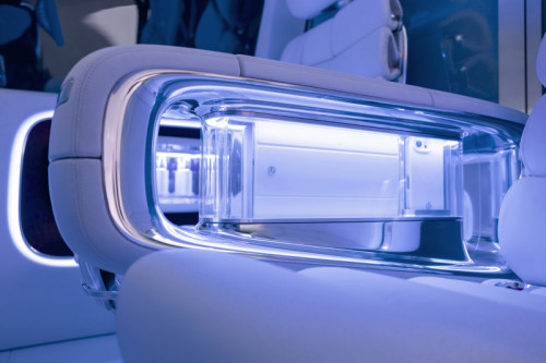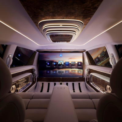 Skóra Nappa w kolorze kryształowej bieli i lśniący biały jedwab kontrastują z dużymi panelami dekoracyjnymi wykonanymi z porowatego drewna. Wzdłuż ścian bocznych umieszczone są elegancka zabudowa na szkło do napojów i witryny z ciemnego drewna, obramowane polerowanymi aluminiowymi listwami wykończeniowymi, które zapewniają miejsce na osobiste akcesoria, takie jak torebka, okulary przeciwsłoneczne lub smartfon. 42 głośniki systemu dźwięku przestrzennego z Dolby Atmos oraz kontroler gier wyścigowych są kolejnymi elementami wyposażenia. Dodatkowe głośniki są zamontowane w okrągłych szklanych obudowach, na ręcznie wykonanych wspornikach wystających ze ścian bocznych – podkreślają one elegancką, przyjazną atmosferę salonu. Konsola środkowa między dwoma indywidualnymi fotelami jest również zaprojektowana w formie gabloty. Posiada panel dotykowy do obsługi systemu informacyjno-rozrywkowego, a także rozkładany stół. Po rozłożeniu stół wygląda jak wysokiej jakości szachownica – kolejny ukłon w stronę piękna i elegancji tradycyjnego rzemiosła. Konsola środkowa automatycznie dostosowuje się do wybranej pozycji siedzeń, zapewniając maksymalny komfort.