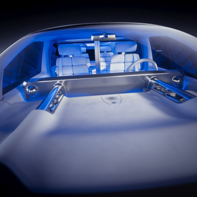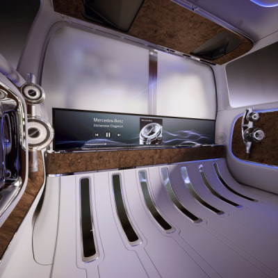 Duże, elektrycznie otwierane drzwi „portalowe” po prawej stronie i oświetlony, chowany stopień wejściowy zapewniają wygodę i łatwy dostęp do luksusowego salonu w tylnej części vana. Inteligentna, przełączalna szklana ściana oddziela „Private Lounge” od strefy kierowcy. W razie potrzeby szkło można zmienić z przezroczystego na matowe, w całości lub częściowo. Strefa „Private Lounge” jest wyjątkowo przestronna. Jej komfort przynosi bezprecedensowe poczucie przestrzeni i wolności, a także bezpieczeństwa i spokoju. Estetyka tego wyjątkowego wnętrza emanuje elegancją połączoną z technologią. Przenosi w ekscytującą cyfrową przyszłość i wyznacza nowe standardy w inżynierii motoryzacyjnej. Tradycyjnie wykonane materiały wykończeniowe łączą się z hipernowoczesnymi, zaawansowanymi technologicznie elementami designu, które są równie stylowe, co zaskakujące.