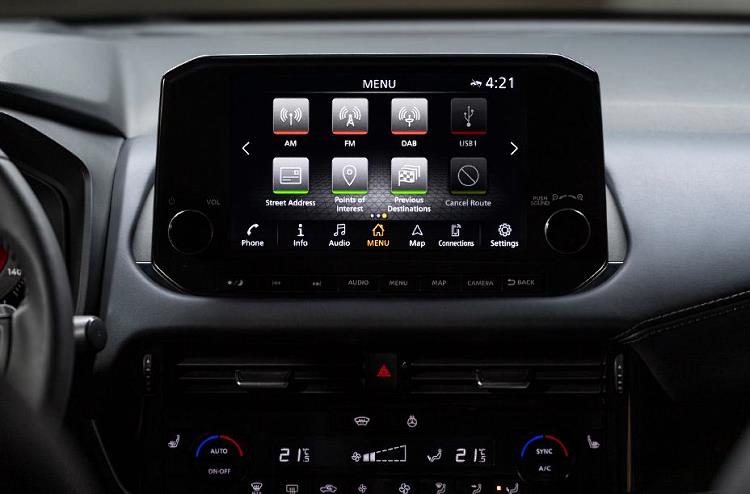 Większy niż dotychczas, dziewięciocalowy wyświetlacz systemu NissanConnect (o wyższej rozdzielczości) to cyfrowy interfejs funkcji nawigacji, informacji, rozrywki i ustawień samochodu, kompatybilny zarówno z Android Auto®, jak i Apple CarPlay®. Umożliwia on również bezprzewodowy dostęp do Apple CarPlay®.