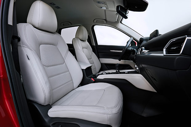 Na wzór wszystkich pozostałych nowych modeli Mazdy, projekt kabiny CX-5 zorientowano wokół inteligentnie rozplanowanego kokpitu, z ergonomicznie rozmieszczonymi wskaźnikami, zegarami i panelami obsługi systemów pokładowych oraz centralnym punktem, jakim jest kierownica. Postawiono na prostotę i elegancję. Trójzegarowy panel instrumentów jest niezwykle czytelny, 7-calowy ekran dotykowy na szczycie deski rozdzielczej posiada system montażu o obniżonej masie własnej, a w słupkach opcjonalnie umieszczono otwory wentylacyjne systemu odparowania bocznych szyb oraz głośniki wysokotonowe zestawu nagłośnienia firmy Bose®. Znaczący wpływ na poprawę komfortu jazdy na tylnych fotelach będzie miał również fakt, iż w tylnej części konsoli środkowej wygospodarowano miejsce na otwory wentylacyjne układu klimatyzacji, a zewnętrzne tylne fotele mogą być wyposażone w system podgrzewania.