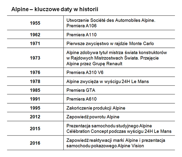 Michael van der Sande, dyrektor zarządzający Alpine, mówi: – „Reaktywowanie modelu, który potrafi wzbudzać taką pasję to ogromny przywilej, ale też wielka odpowiedzialność. Pasja do Alpine jest żywa zarówno w Grupie Renault, jak też wśród entuzjastów samochodów sportowych. Od dawna zamierzaliśmy przywrócić markę Alpine. I teraz nadszedł ten czas.