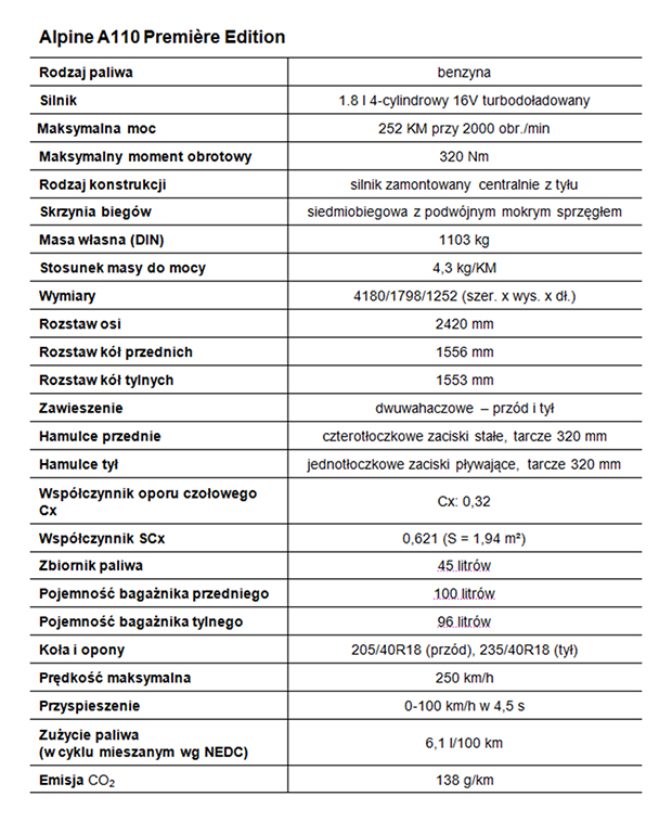 Dzięki umieszczonemu centralnie sportowemu wydechowi, który jest standardowym wyposażeniem Première Edition, A110 łączy spokojną jazdę na co dzień w trybie Normal ze zdecydowanie agresywnym brzmieniem samochodu sportowego w przypadku trybów Sport i Track. Turbodoładowany czterocylindrowy silnik z bezpośrednim wtryskiem o pojemności 1,8 litra, w którym Alpine zmieniło układ dolotowy, wydech i system turbo oraz ustawienia pracy, osiąga maksymalną moc 252 KM przy 6000 obr./min oraz moment obrotowy 320 Nm już od 2000 obr./min.