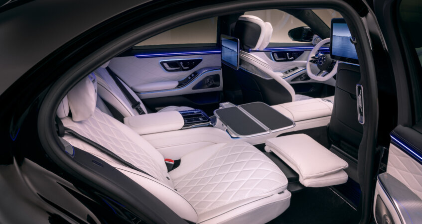 Klasa S winduje swoją pozycję jako najwyższej klasy biznesowa limuzyna, oferując szereg udoskonaleń w zakresie produktywności i rozrywki zarówno dla podróżujących z przodu, jak i pasażerów z tyłu. Osoby zajmujące tylne siedzenia korzystają z ulepszonej koncepcji obsługi, z dwoma większymi, 13,1-calowymi ekranami systemu rozrywki MBUX High-End Rear Seat Entertainment System oraz dwoma nowymi, odłączanymi pilotami MBUX – po jednym dla każdego pasażera, które umożliwiają w pełni indywidualną kontrolę. Za ich pomocą można sterować systemem rozrywki MBUX High-End Rear Seat Entertainment, regulować głośność, ustawiać ambientowe oświetlenie, konfigurować klimatyzację w tylnej części kabiny oraz obsługiwać funkcje foteli (regulacja, podgrzewanie, wentylacja i masaż), a nawet zamykać rolety tylnych szyb. Piloty są przechowywane w stacji dokującej z mechanizmem blokowania w składanym podłokietniku lub konsoli biznesowej, ale pozostają w pełni funkcjonalne po wyjęciu – umożliwiając na przykład odchylenie fotela, uruchomienie masażu i regulację temperatury podczas wybierania treści na tylnych ekranach, bez konieczności sięgania do wyświetlacza.