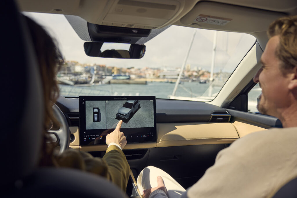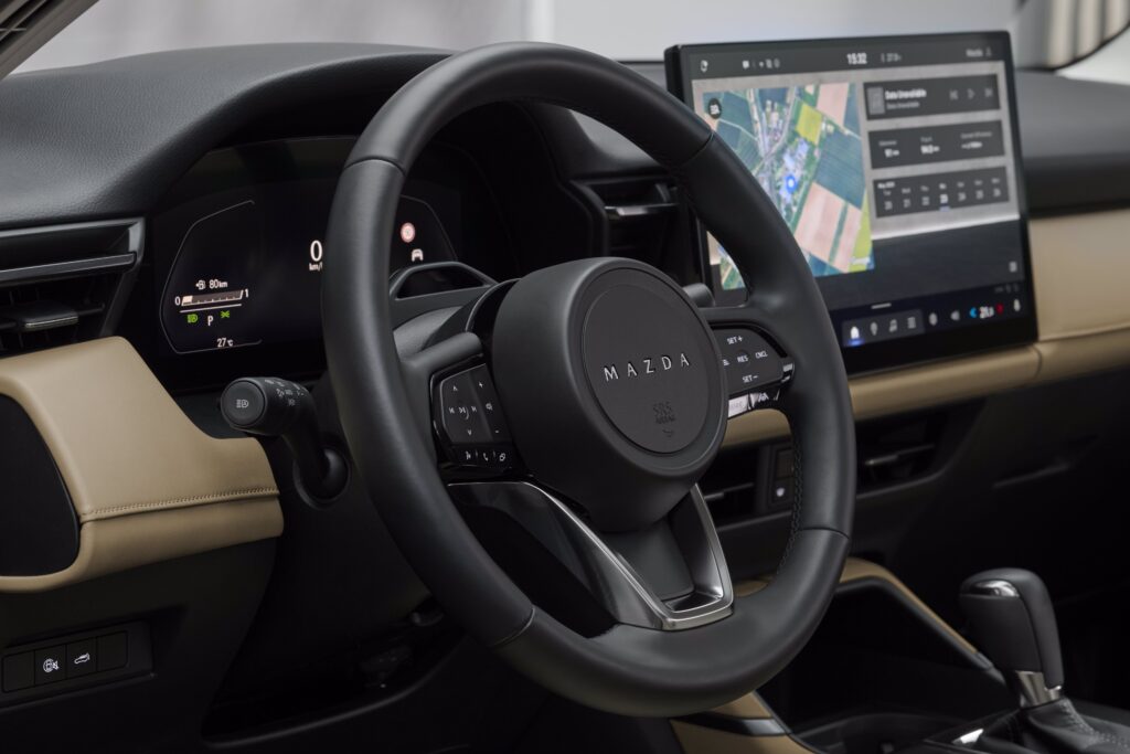 Nowy interfejs HMI został zaprojektowany tak, aby zapewnić kierowcom pełną kontrolę, minimalizując jednocześnie rozproszenie uwagi wzrokowej, manualnej i poznawczej. Odziedziczył filozofię bezpieczeństwa Mazdy, dążąc do prostoty i łatwości obsługi w każdej interakcji. W centrum mocnego, poziomego układu znajduje się nowy, zintegrowany wyświetlacz dotykowy – dostępny w rozmiarach 12,9 lub 15,6 cala, z konfigurowalną interakcją w stylu smartfona. Główne elementy sterujące są zgodne z logiką bezpieczeństwa: fizyczne przyciski pozostają dla podstawowych funkcji, a często używane funkcje są umieszczone wyżej i stale widoczne, co ogranicza ruchy oczu. Wszystkie modele są wyposażone w 10,25-calowy cyfrowy zestaw wskaźników i wyświetlacz przezierny (HUD) 1 , który jest większy niż dotychczas. Pojemnościowe przełączniki na kierownicy konsolidują kluczowe funkcje, takie jak widok 360 stopni i Mi-Drive, jednocześnie umożliwiając tradycyjne korzystanie z przycisków. Wysokoprecyzyjne rozpoznawanie głosu dodatkowo umożliwia pełną kontrolę bez odrywania rąk od kierownicy.