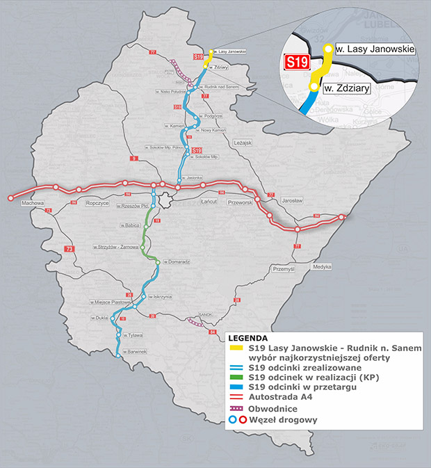 Odcinek S19 Lasy Janowskie – Zdziary, na który dokonano we wtorek 20 lutego 2018 r. wyboru najkorzystniejszej oferty, jest częścią dużego przetargu obejmującego swym zakresem zaprojektowanie i budowę drogi ekspresowej S19 na odcinku od węzła „Lasy Janowskie” do węzła „Nisko Południe”.