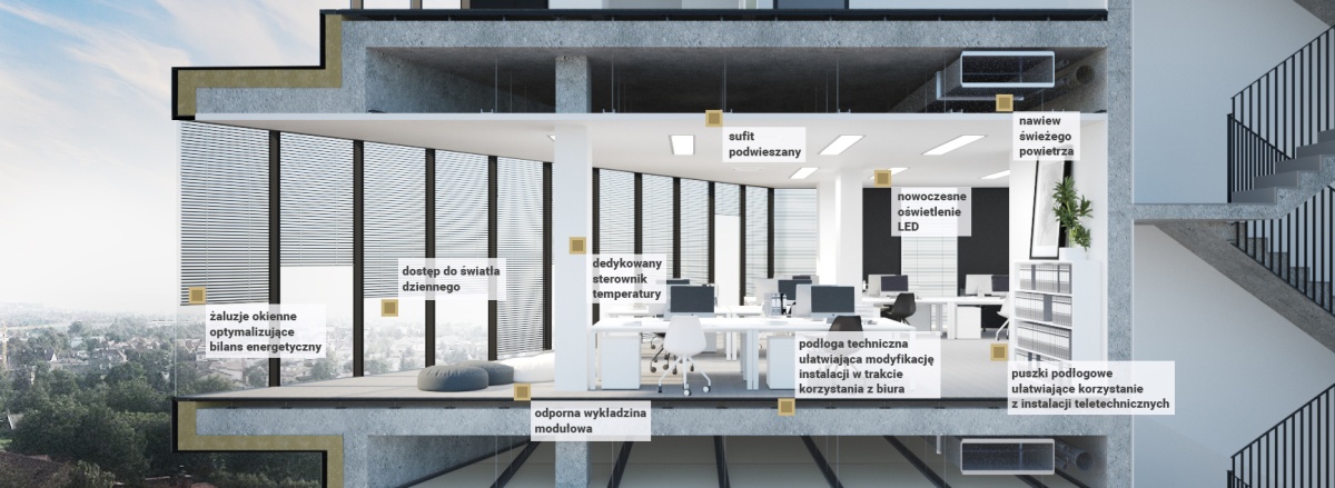 Za przeszklonymi fasadami elewacji kryje się 5 kondygnacji, na których mieszczą się biura o powierzchni najmu od 100 m² do 3 000 m². Parkingi są nie tylko obok budynku, ale również w dwukondygnacyjnym garażu podziemnym, który zgodnie z filozofią eko kryje stacje ładujące samochody elektryczne, rowerownie z szatniami i łazienkami. Umieszczona tu myjnia samochodowa to wyjątkowa wygoda dla właścicieli samochodów. Z parkingu łatwo dostaniemy się do biur jedną z trzech cichobieżnych wind. Standardy bezpieczeństwa budynku są bardzo wysokie. Zarówno, jeśli chodzi o systemy BHP, jak i zabezpieczenie przed dostępem osób nieuprawnionych. Monitoring i zapis kamer uzupełniają alarmy przeciwwłamaniowe oraz System Kontroli Dostępu, wymagający użycia karty przy wchodzeniu do budynku i biur. Jednocześnie umożliwia on bezpieczne korzystanie z pomieszczeń przez 24 h na dobę.