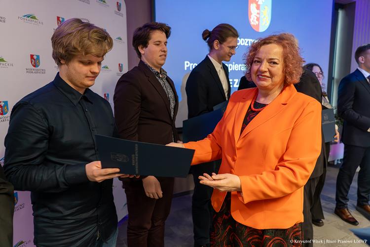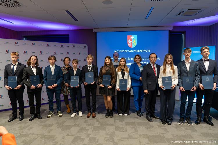 Podkarpackie Centrum Innowacji gościło dziś młodych, zdolnych uczniów z województwa podkarpackiego, którzy zostali wyróżnieni w ramach programu Samorządu Województwa „Nie zagubić talentu”. Podczas uroczystej gali marszałek Województwa Władysław Ortyl wręczył stypendia naukowe dla 85 uczniów szkół podstawowych i ponadpodstawowych, doceniając ich wybitne osiągnięcia w nauce. W wydarzeniu uczestniczyli również wicemarszałek Piotr Pilch i członek zarządu Anna Huk oraz radni województwa Ewa Draus, Adam Berkowicz i Bronisław Baran. Obecne były także: Dorota Nowak-Maluchnik, Podkarpacki Kurator Oświaty i Krystyna Wróblewska, dyrektor Podkarpackiego Zespołu Placówek Wojewódzkich w Rzeszowie oraz Barbara Pelczar Białek, dyrektor Departamentu Edukacji, Nauki i Sportu w Urzędzie Marszałkowskim.