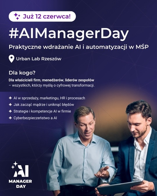 12 czerwca 2025 r. w Rzeszowie odbędzie się pierwsza edycja AI Manager Day – konferencji zaprojektowanej dla osób zarządzających firmami i działami odpowiedzialnymi za rozwój, operacje i technologię. To wydarzenie dla tych, którzy chcą wdrażać sztuczną inteligencję nie jako trend, ale jako narzędzie budujące realną przewagę operacyjną i strategiczną.