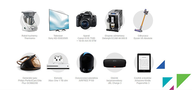 Uczestnicy loterii powalczą o takie nagrody jak: thermomix, telewizor Sony, aparat fotograficzny Canon EOS 750D z obiektywem 18-55 mm IS STM, ekspres ciśnieniowy Delongh, odkurzacz Dyson V8 Absolute, generator pary Philips PerfectCare, Xbox one 1 TB slim wraz z grą, oczyszczacz powietrza AIRFREE P150, głośnik bezprzewododwy JBL Charge 3 i czytnik e-booków Amazon Kindle Paperwhite 3.