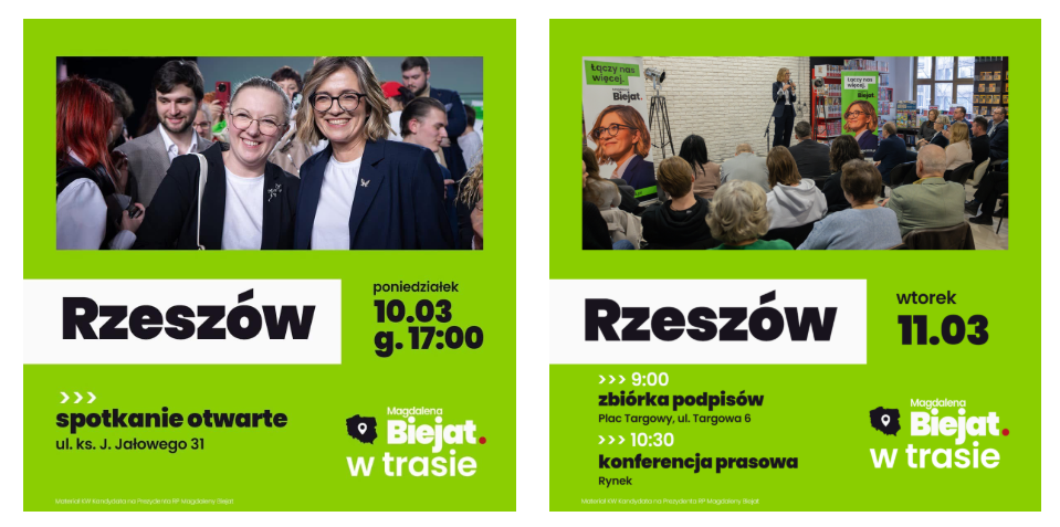 📅 11 marca (wtorek) 🔹 9:00 – Zbiórka podpisów w Rzeszowie (Plac Targowy, ul. Targowa 6) 🔹 10:30 – Konferencja prasowa na Rynku w Rzeszowie 🔹 11:45 – Wizyta w piekarni w Rudniku nad Sanem (ul. Stróżańska 61a) 🔹 12:30 – Kawa i rozmowy o przyszłości w sklepie firmowym piekarni (ul. Sandomierska)