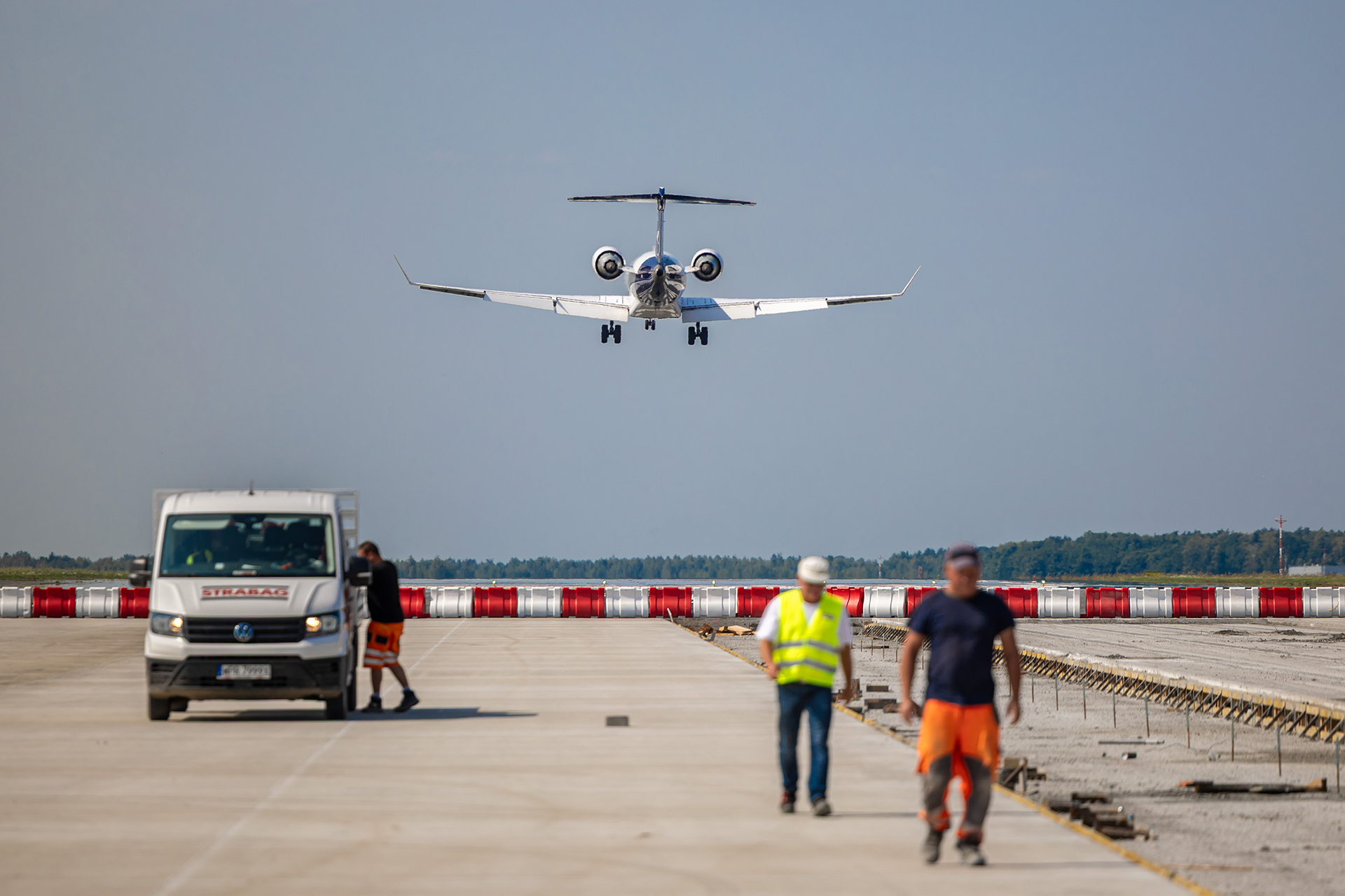 Przez cały okres realizacji prace budowlane prowadzone są w taki sposób, aby zapewnić ciągłość obsługi lotów i minimalizować wpływ inwestycji na bieżące operacje. Obecnie prowadzone są roboty związane z odtworzeniem oświetlenia nawigacyjnego i oznakowania poziomego, a także prace wykończeniowe w pasie przebudowywanego odcinka drogi startowej.