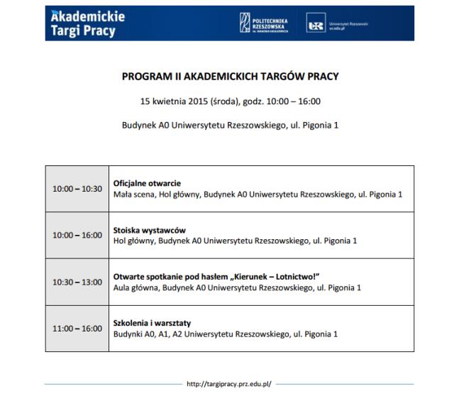 II Akademickie Targi Pracy organizowane wspólnie przez dwie największe uczelnie w województwie: Biuro Karier Uniwersytetu Rzeszowskiego oraz Dział Informacji, Karier i Promocji Politechniki Rzeszowskiej. Oferta targów skierowana jest nie tylko do studentów i absolwentów, mogą w nich uczestniczyć osoby w każdym wieku, które poszukują zatrudnienia. Uczestnicy będą mieli okazję zapoznać się z wieloma atrakcyjnymi ofertami pracy, staży oraz praktyk.