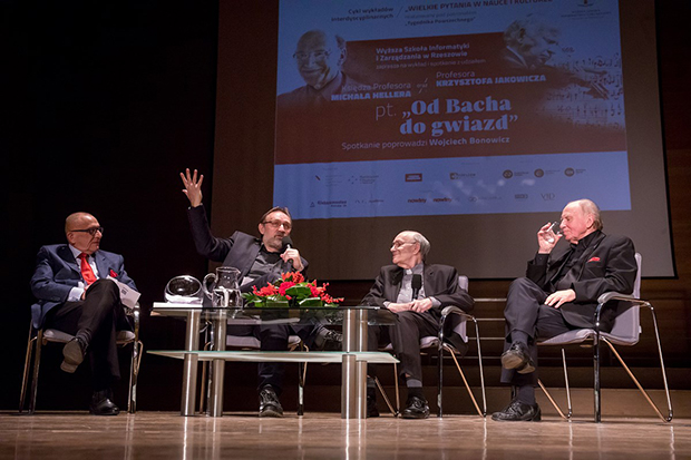 Wykład otwarty ks. prof. Hellera, na który rezerwacje wyczerpały się długo przez 12 grudnia br., zatytułowany został „Od Bacha do gwiazd”. Wygłoszony został w ramach wykładów „Wielkie pytania w nauce i kulturze” organizowanych przez Wyższą Szkołę Informatyki i Zarządzania w Rzeszowie pod patronatem „Tygodnika Powszechnego”. – Patronat honorowy nad wydarzeniem objęło Ministerstwo Nauki i Szkolnictwa Wyższego oraz Podkarpackie Kuratorium Oświaty. Przedsięwzięcie realizowane jest we współpracy z Fundacją Centrum Kopernika w Krakowie oraz z wydawnictwem Copernicus Center Press. Partnerem strategicznym wydarzenia jest Urząd Miasta Rzeszowa – przypomniał dr Wergiliusz Gołąbek, rektor WSIiZ, witając publiczność w Filharmonii Podkarpackiej im. Artura Malawskiego.