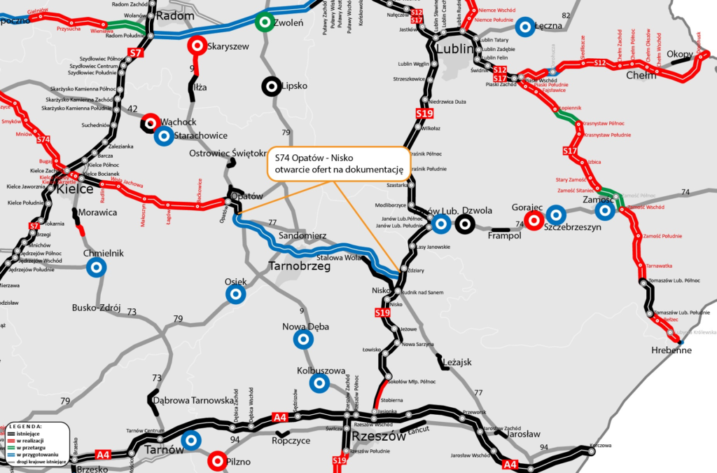 Generalna Dyrekcja Dróg Krajowych i Autostrad – Oddział Rzeszów otworzył oferty w przetargu na wykonanie elementów Koncepcji programowej wraz z pełnym rozpoznaniem geologicznym pod budowę drogi ekspresowej S74 na odcinku Opatów – Nisko. Wykonaniem dokumentacji zainteresowanych jest 14 firm i konsorcjów.