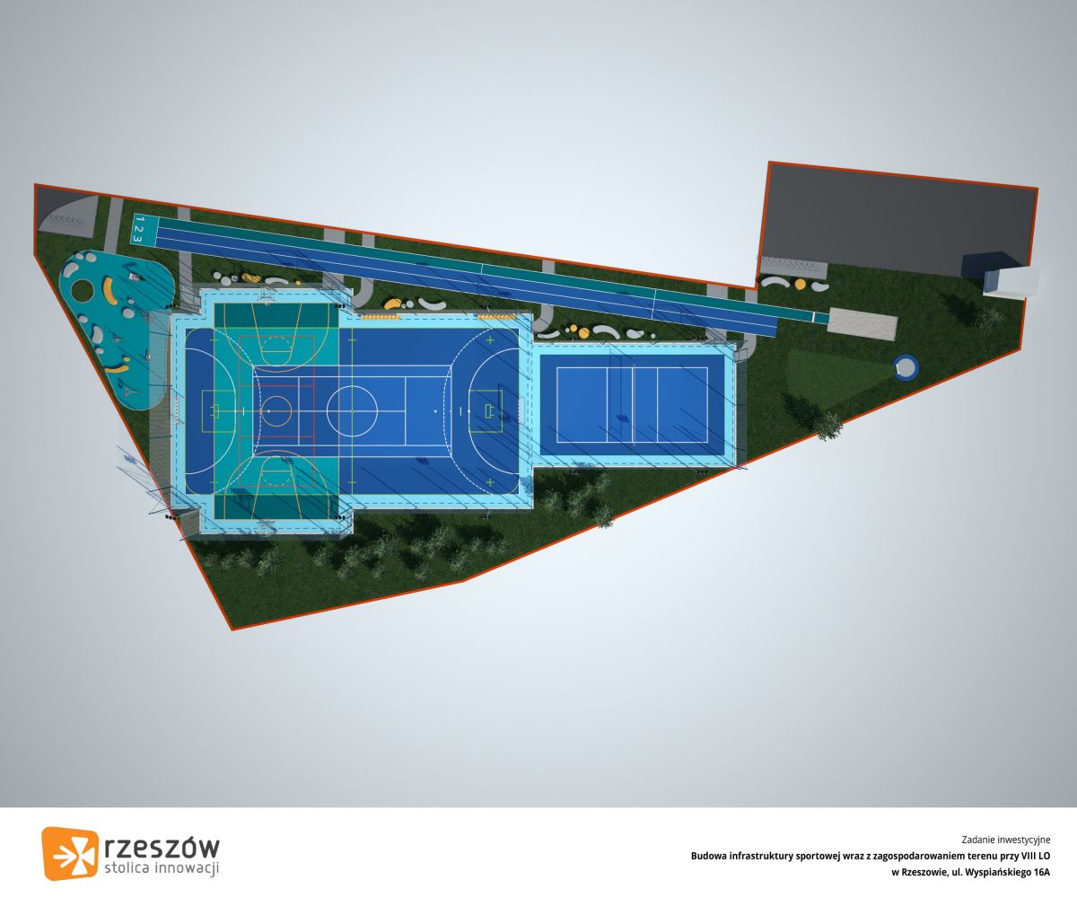 Zakres inwestycji, która będzie wykonana przy ul. Wyspiańskiego, na terenie VIII LO był ustalany wspólnie z dyrekcją i pracownikami szkoły. Przygotowując zadanie uwzględniono także zapotrzebowanie mieszkańców osiedla Króla Augusta, gdzie znajduje się szkoła, a także osiedli sąsiednich – Kmity i Pułaskiego na tereny służące sportowi. Efektem tych analiz jest koncepcja, która zakłada budowę dwóch boisk wielofunkcyjnych, o nawierzchni poliuretanowej. Pierwsze z nich będzie mieć powierzchnię 40 na 20 m i będzie mogło służyć zarówno do gry w piłkę nożną, piłkę ręczną i unihokeja jak też i tenisa ziemnego, koszykówkę i siatkową. Drugie z boisk będzie przystosowane do gry w siatkówkę i w tenisa ziemnego.