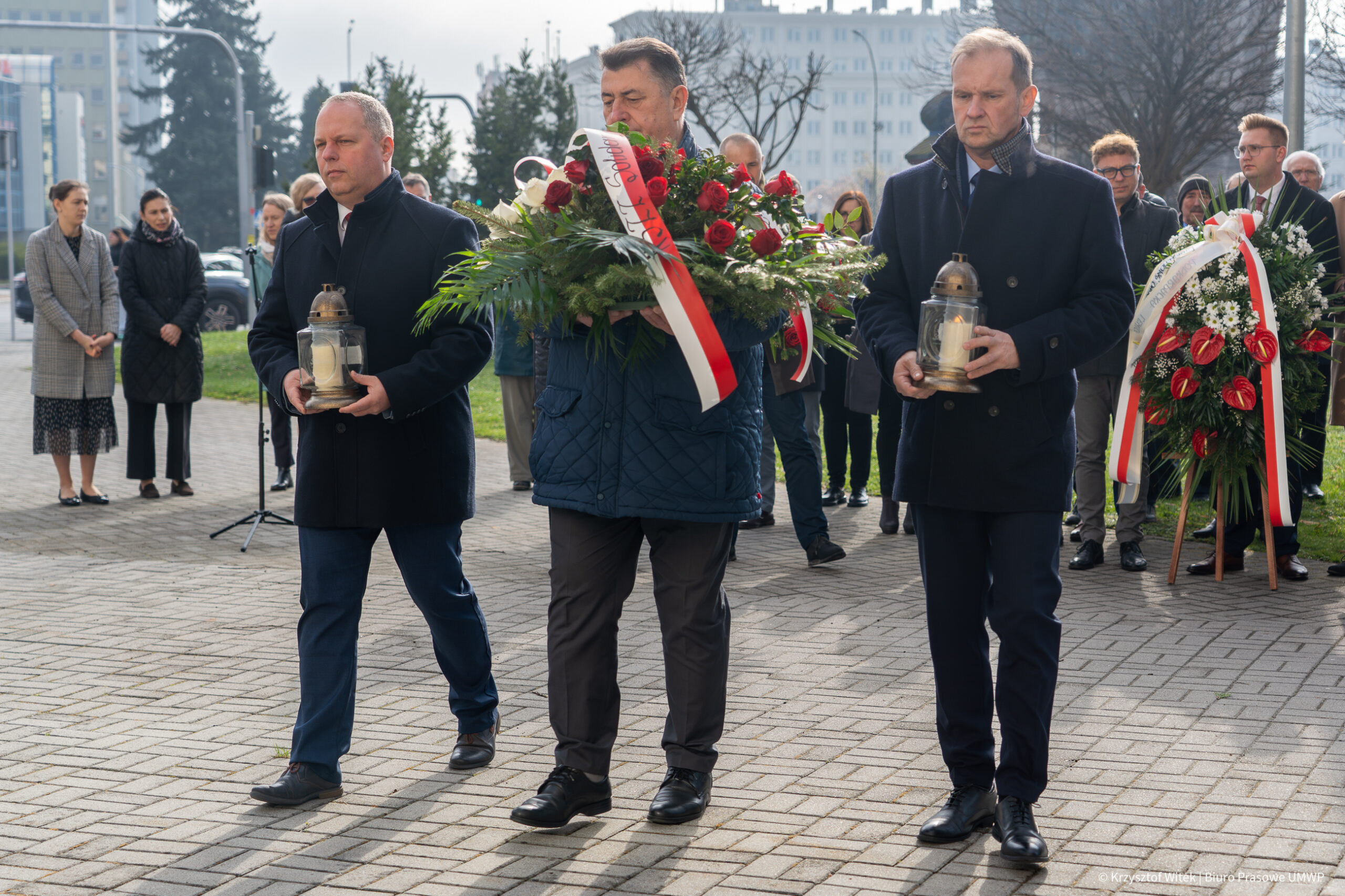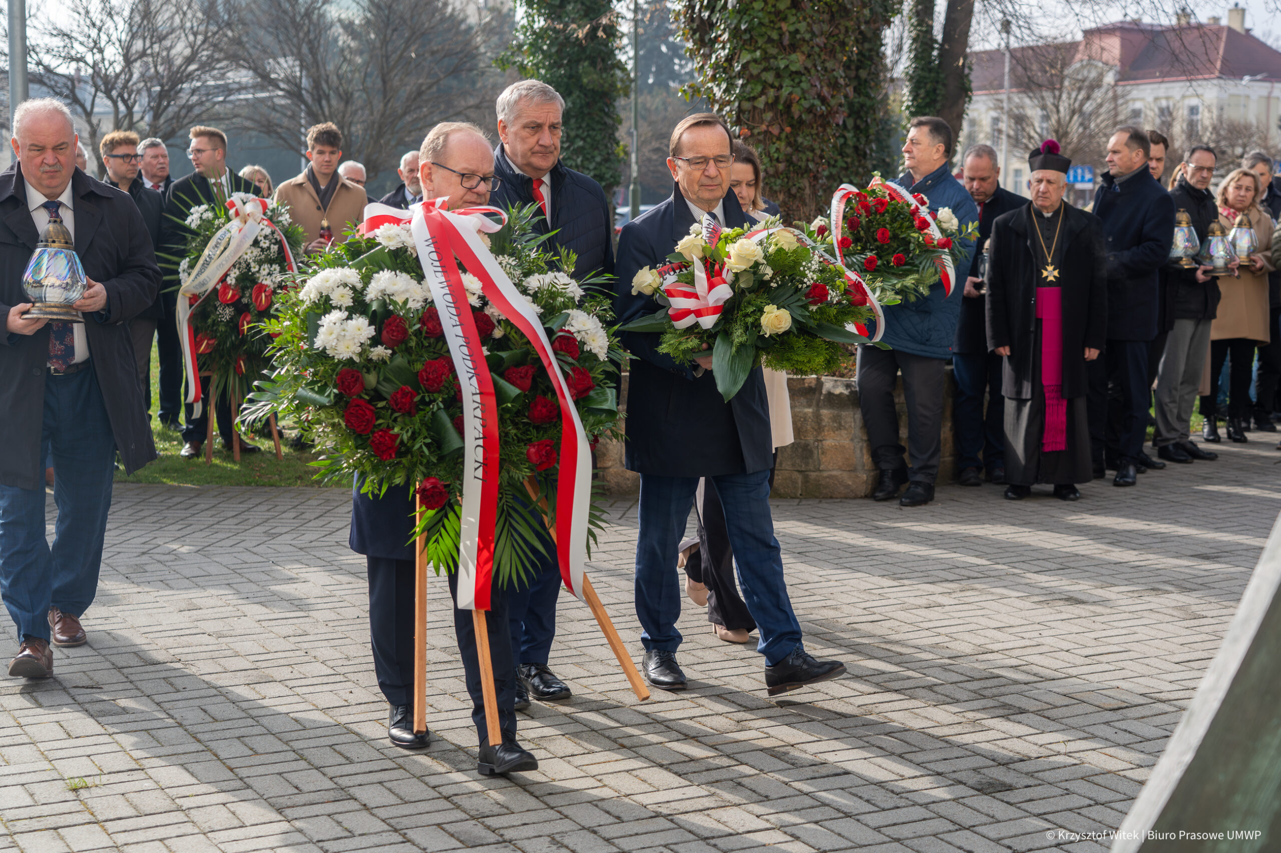 W imieniu mieszkańców regionu, wieńce i wiązanki kwiatów złożyli przedstawiciele władz. W hołdzie zmarłym, w imieniu Zarządu Województwa Podkarpackiego, pokłonił się marszałek Władysław Ortyl oraz wicemarszałek Piotr Pilch wraz z członkiem zarządu Anną Huk. Wieniec przed pomnikiem złożyli również sekretarz stanu w Ministerstwie Spraw Wewnętrznych i Administracji Wiesław Szczepański oraz wicewojewoda podkarpacki Wiesław Buż. Wiązanki kwiatów pozostawili także radny województwa Marcin Fijołek, przedstawiciele NSZZ „Solidarność” z przewodniczącym Regionu Rzeszowskiego Romanem Jakimem na czele, a także Krystyna Wróblewska, dyrektor Podkarpackiego Zespołu Placówek Wojewódzkiego w Rzeszowie. W uroczystości uczestniczyli również duchowni ks. prałat Jan Szczupak, proboszcz rzeszowskiej Fary, oraz ojciec Joachim Ciupa, kustosz sanktuarium Matki Bożej Rzeszowskiej i gwardian klasztoru Ojców Bernardynów. W milczącym hołdzie głowy przed pomnikiem skłonili także pracownicy urzędu marszałkowskiego. Wspólnotę zgromadzonych połączyła modlitwa, którą poprowadził ks. prałat Jan Szczupak.