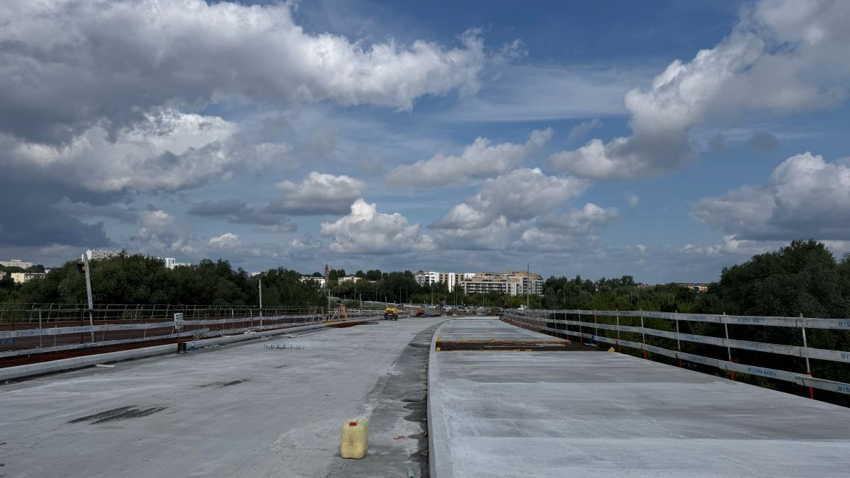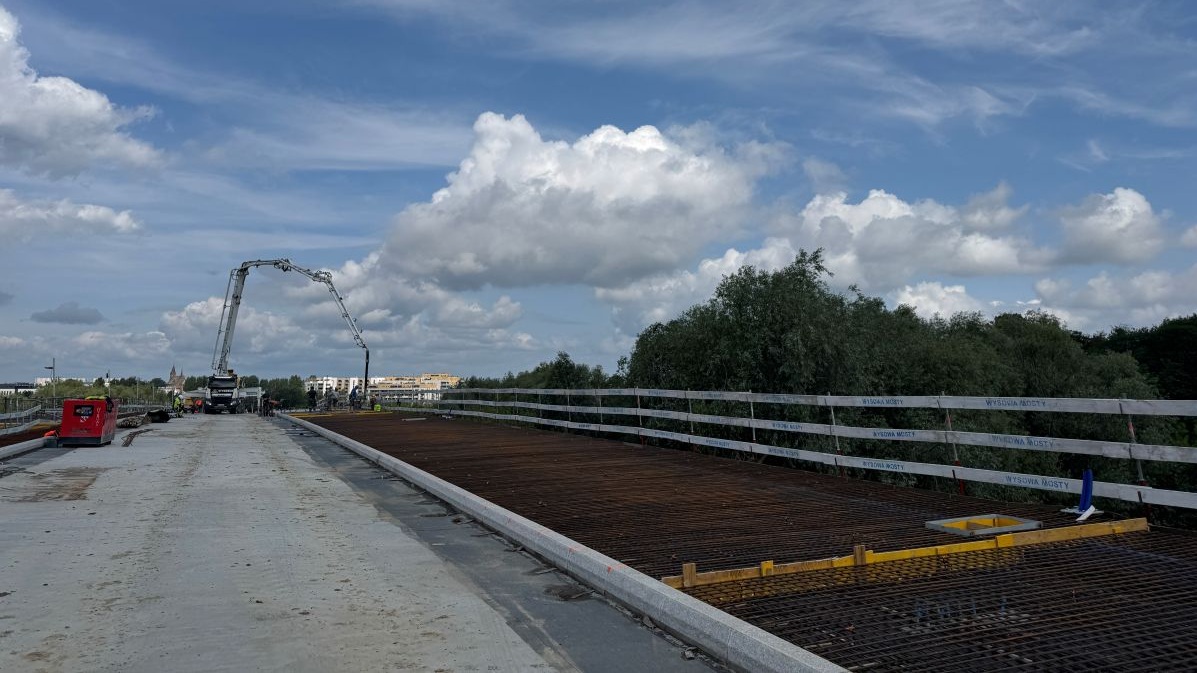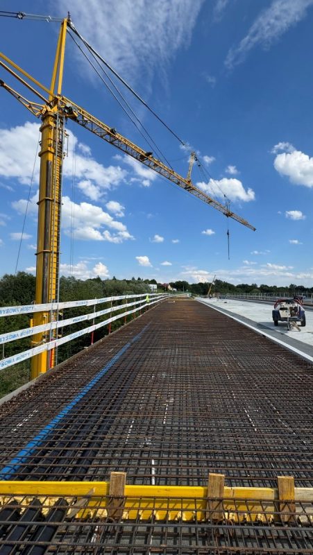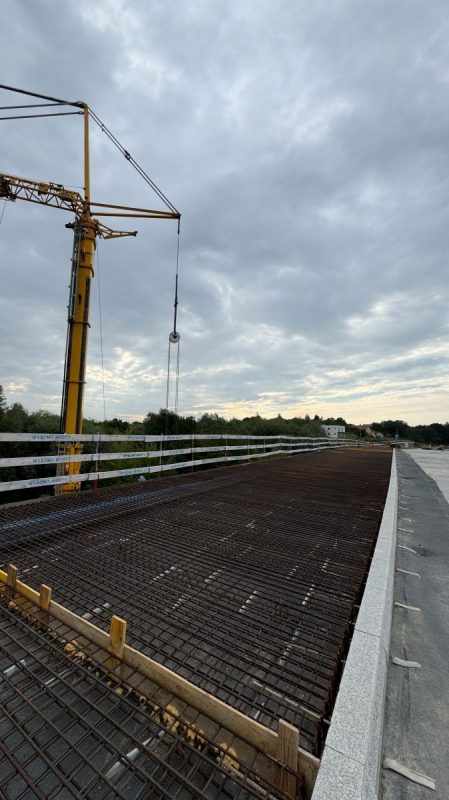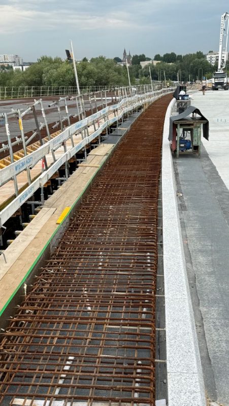 Jeśli chodzi i pozostałe roboty prowadzone na estakadzie to obecnie trwają prace nad montażem zbrojenia i betonowaniem kap chodnikowych na ustroju jedni prawej. Dodatkowo na estakadzie jezdni prawej wykonywane są roboty w zakresie „Zabezpieczenia antykorozyjnego powierzchni betonowych”.
