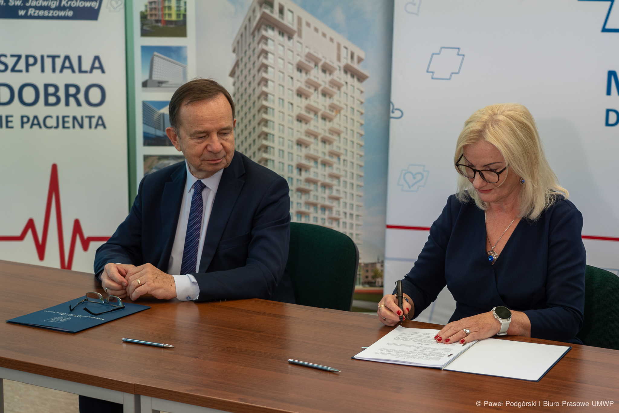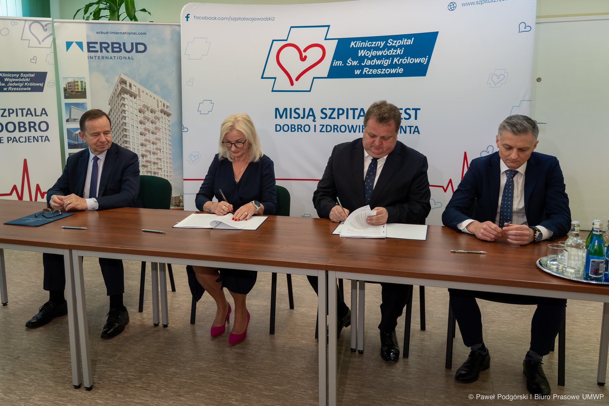 W rzeszowskim szpitalu podpisy pod umową na budowę lądowiska, które znajdzie się na dachu wielopoziomowego parkingu, w obecności marszałka Władysława Ortyla podpisała dyrektor Klinicznego Szpitala Wojewódzkiego Barbara Rogowska oraz przedstawiciele wykonawcy, firmy Erbud International sp. z o.o. – prezes Mirosław Młynarski oraz wiceprezes Krzysztof Gaweł.