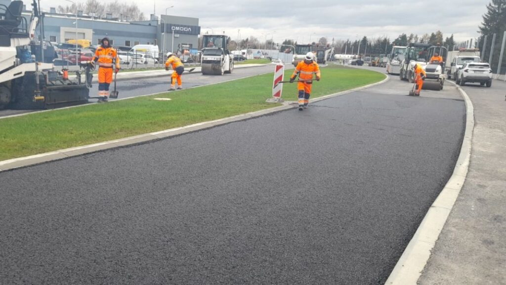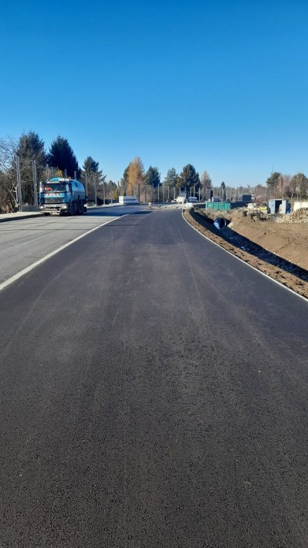 Obecnie trwa układanie ostatniej warstwy ścieralnej na nowo budowanej drodze KDG. Zakończono roboty związane z układaniem warstw bitumicznych na ciągach pieszo – rowerowych.