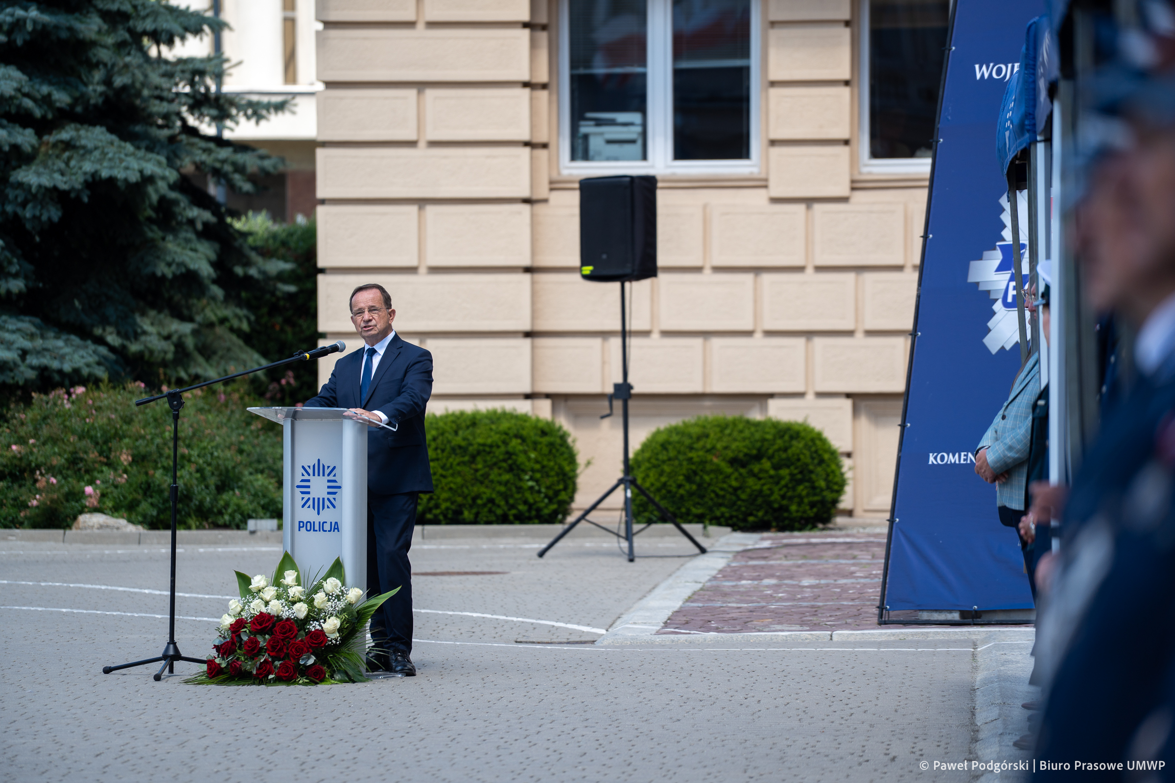 ,,To dla mnie ogromny zaszczyt, że w tym wyjątkowym dniu mogę stanąć przed Państwem i uczestniczyć w tej uroczystości. Z okazji 106. rocznicy powołania Policji Państwowej składam wyrazy uznania wszystkim funkcjonariuszkom, funkcjonariuszom oraz pracownikom cywilnym podkarpackiego garnizonu. Misją każdego policjanta jest ochrona życia, zdrowia i mienia obywateli oraz zapewnienie bezpieczeństwa publicznego. Wasza codzienna służba i praca, choć często niedostrzegalna, jest niezwykle istotna – to ona stanowi fundament porządku i spokoju społecznego. Pamiętajcie, że każdy patrol, każda interwencja i każda rozmowa z mieszkańcem mają znaczenie. Zaufanie społeczne buduje się latami – poprzez sumienną, rzetelną i uczciwą służbę. Jestem niezwykle dumny, że z poświęceniem i oddaniem pełnicie swoje obowiązki. Dzięki Waszemu zaangażowaniu osiągacie znakomite efekty, które są najlepsza wizytówką naszej formacji” – mówił Zastępca Komendanta Głównego Policji nadinsp. Tomasz Michułka.