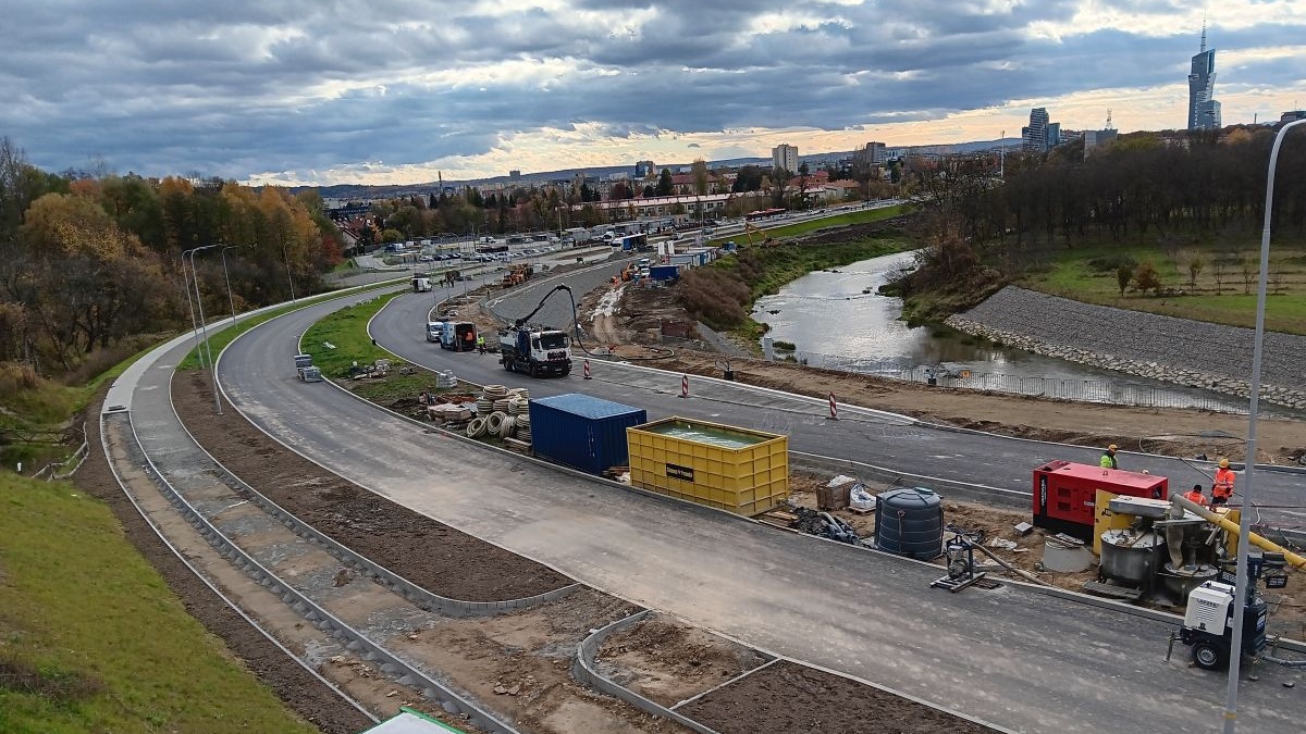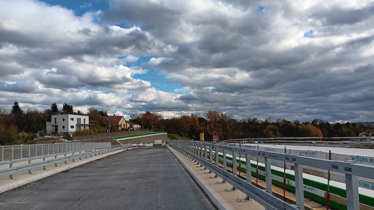 Z kolei na kluczowym obiekcie inwestycji tj. estakadzie zabetonowano i sprężono ustroje nośne obydwu jezdni. Na jezdni prawej estakady i dojazdach wykonano już w pełnym zakresie kapy chodnikowe wraz z nawierzchnią z żywicy epoksydowej, dodatkowo wykonano elementy bezpieczeństwa ruchu w postaci barier ochronnych i balustrady. W zakresie samej jezdni została wykonana izolacja ustroju nośnego i warstwa wiążąca z asfaltu twardolanego. Z kolei na jezdni lewej estakady zabetonowano kapy chodnikowe oraz rozpoczęto roboty związane z hydroizolacją płyty pomostu. Natomiast na dojazdach do estakady ułożone już pierwsze warstwy konstrukcyjne nawierzchni.