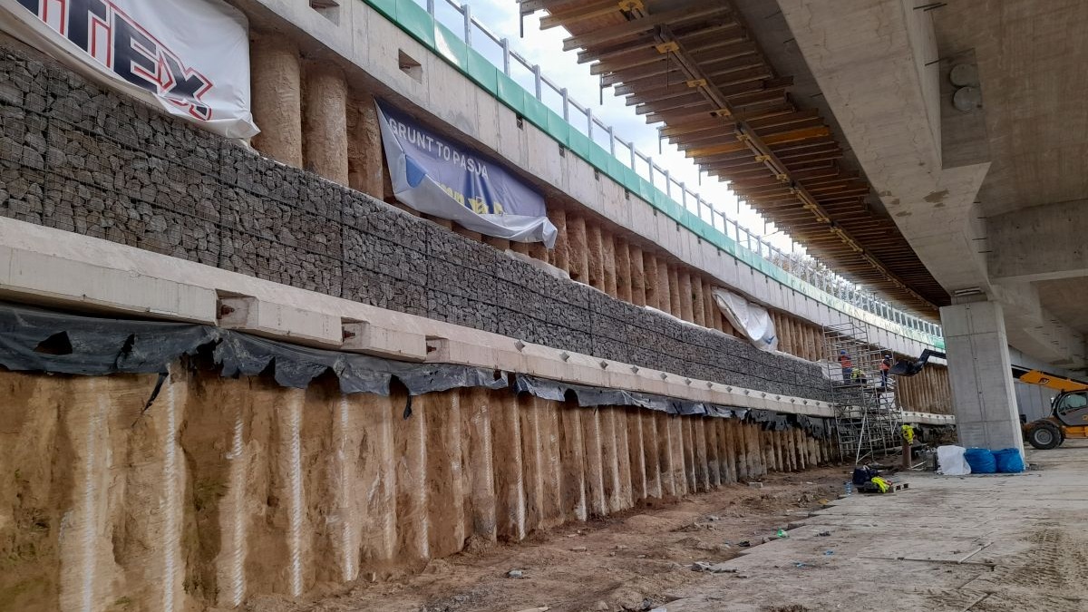 Kolejnym obiektem inżynierskim realizowanym w ramach inwestycji jest mur oporowy w rejonie ul. Konfederatów Barskich, wykonany w technologii kotwionej palisady z pali wierconych w osłonie rurowej. Wykonano zwieńczenie muru oczepem żelbetowym. Zakończono prace polegające na wykonaniu oblicowania w postaci koszy siatkowo-kamiennych.