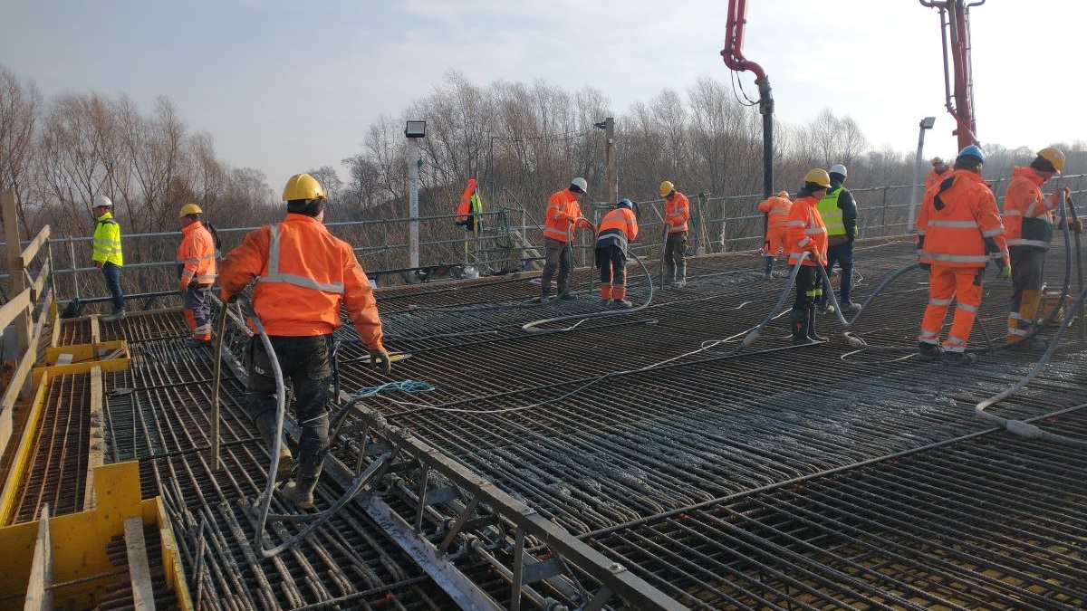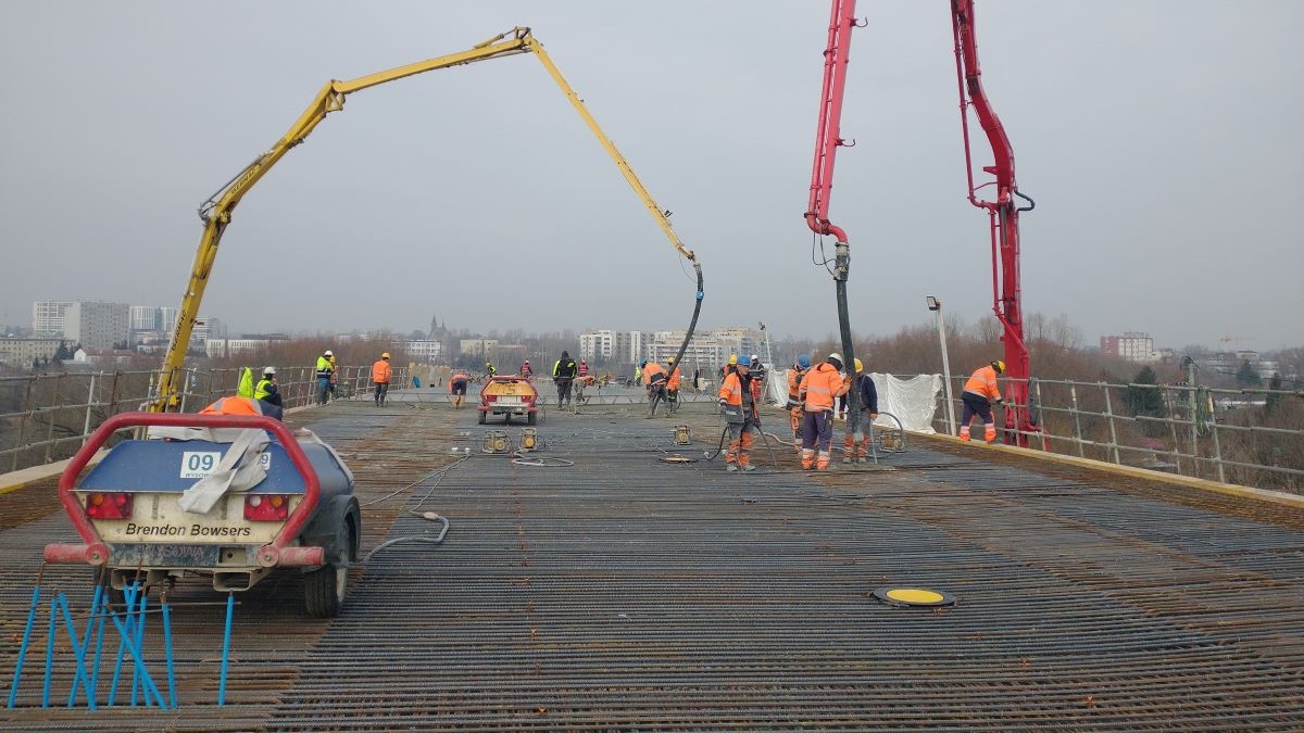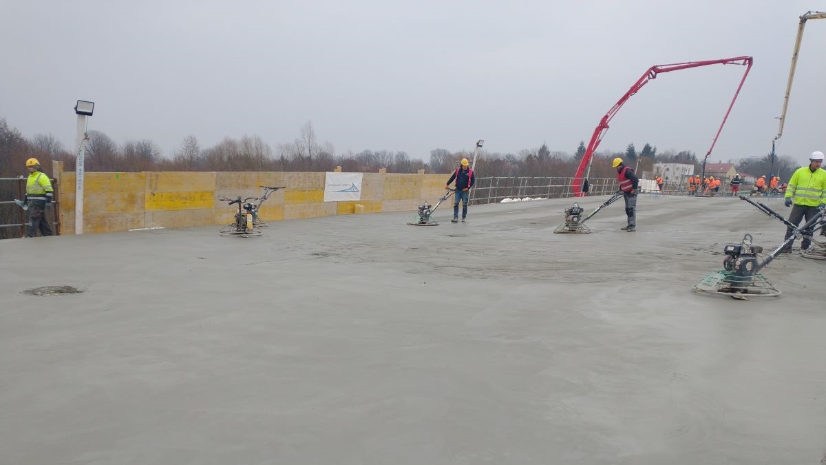 Betonowanie rozpoczęto w dniu 26.02.2025 r. od godz. 6.00, prowadzone je w sposób ciągły przez ok. 60 godz. Brygady składały się z dwóch 30 osobowych zespołów pracujących w trybie po 12 godzin. Podczas betonowania beton był dostarczany 20 betonowozami z dwóch wytwórni jednocześnie. Betonowanie odbywał się przy użyciu 2 pomp.