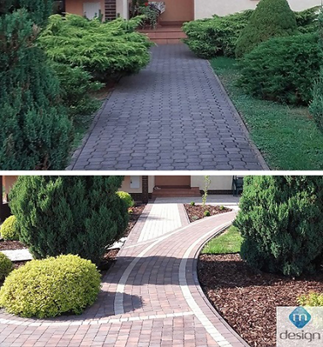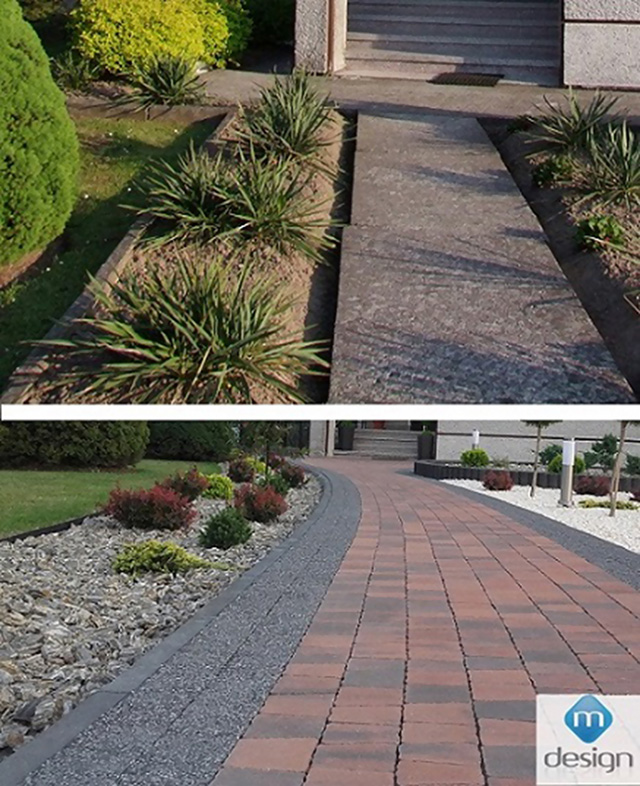 W przypadku drugiej metamorfozy, mało estetyczną alejkę z luźno ułożonych płyt chodnikowych, bez krawężników czy obrzeży, zastąpiono eleganckim chodnikiem z dodatkiem płukanej kostki w kolorze grafitowym. Szeroki, mieniący się różnymi kolorami chodnik jest teraz elegancki, bezpieczny i atrakcyjny – niezależnie od pory roku. Otaczają go wstęgi drobnych kamyków oraz dekoracyjna roślinność, w wyniku czego nawierzchnia chodnika pełni główną rolę w aranżacji.