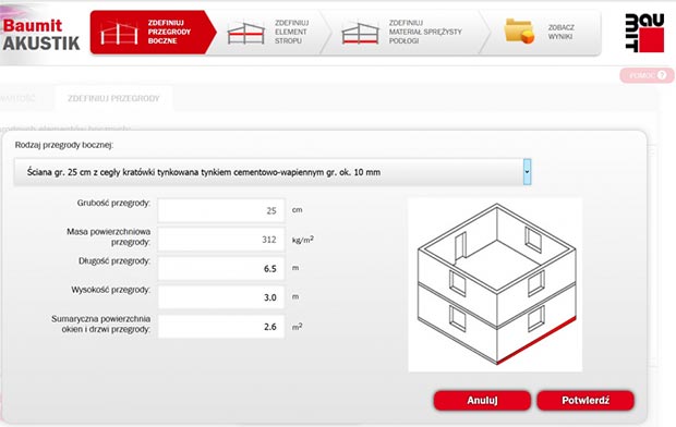 Konkretne wymagania dotyczące izolacyjności akustycznej budynków i elementów budowlanych określa norma PN-B-02151-3:2015-10, różnicując je w zależności od rodzaju obiektu. Poruszanie się w gąszczu oznaczeń i wartości może sprawiać problemy nawet doświadczonym fachowcom. Dlatego aby przyspieszyć proces oceny izolacyjności akustycznej od dźwięków uderzeniowych projektowanego lub istniejącego budynku można posłużyć się specjalnym oprogramowaniem. Aplikacja Baumit AKUSTIK wykorzystuje m.in. dane dotyczące stropu oraz poszczególnych warstw podłogi, a także przenoszenia bocznego dźwięków, pozwalając określić prognozowaną izolacyjność akustyczną dla podanego układu podłogi.