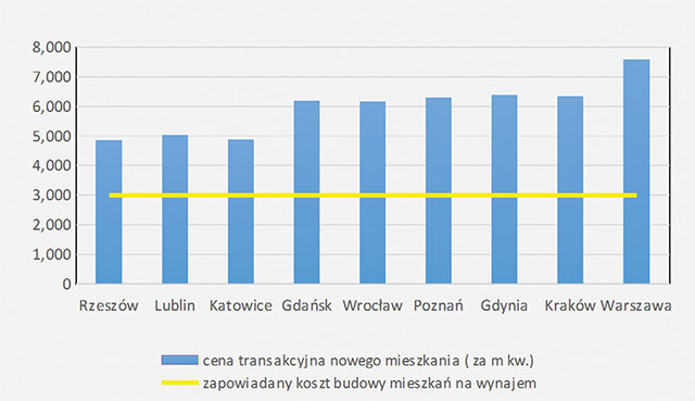 Odrębną, ciekawą kwestią jest planowany poziom budownictwa czynszowego. Zakładając, że rząd chce dojść do poziomu 435 mieszkań na 1000 mieszkańców w ciągu ok. 15 lat, musielibyśmy budować rocznie ok. 180 tys. mieszkań, a więc o ok. 30 tys. więcej niż obecnie. Do tego dochodzą kwestie odnowy tzw. substandardowej substancji mieszkaniowej, co również szacuje się na ok. 20 tys. mieszkań rocznie. Oznaczałoby to, że państwo stałoby się największym deweloperem w kraju, z udziałem 16-25% całego rynku. Zastanowienia wymaga kwestia, gdzie będzie adresowane wsparcie, do jakich miejscowości. Czy wzorem poprzednich programów trafi do największych miast, gdzie trzy województwa potrafiły konsumować 50% wsparcia państwa. Pierwsze pilotaże wskazują, że mniejsze miasta też mają szanse i być może to dobry kierunek, bo w niektórych z nich nie budowano nowych mieszkań od 10-15 lat.