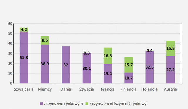 Aż 30% Szwedów mieszka w lokalu wynajmowanym na zasadach rynkowych. Podobnie w Danii, gdzie wskaźnik ten wynosi 37% . W efekcie powyższe kraje nie borykają się z problemem mieszkania osób dorosłych w wieku powyżej 25 lat z rodzicami. Dla porównania, w Polsce po cenach rynkowych mieszkanie wynajmuje tylko 4,2% obywateli, a ponad 2,8 mln młodych Polaków mieszka „na garnuszku rodziców”.