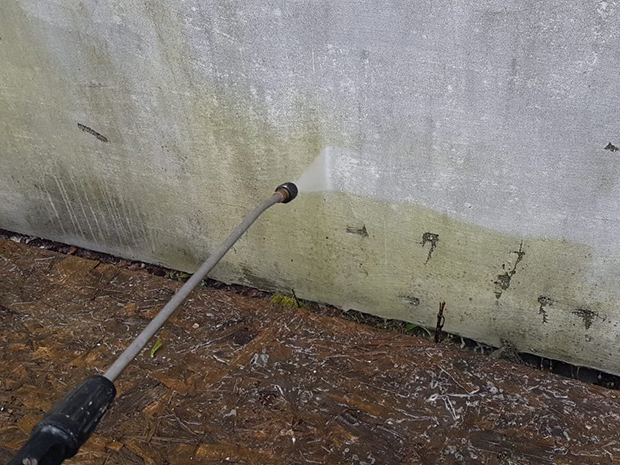 Przed naniesieniem preparatu czyszczącego, za pomocą myjki ciśnieniowej dokonujemy wstępnego zmycia powierzchni ściany. Fot.Materiał prasowy