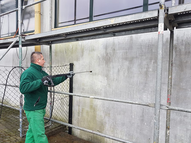Przed naniesieniem preparatu czyszczącego, za pomocą myjki ciśnieniowej dokonujemy wstępnego zmycia powierzchni ściany. Usuwamy w ten sposób warstwę kurzu i zabrudzenia mechaniczne. Wilgotną powierzchnię, od góry do dołu spryskujemy odpowiednio rozcieńczonym preparatem czyszczącym. Bezpośrednio po zakończeniu nanoszenia preparatu na ścianę przystępujemy do jej spłukania za pomocą myjki ciśnieniowej, również od góry do dołu.