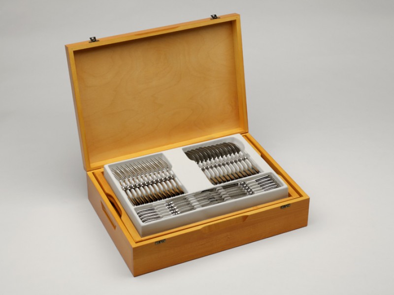 Piękna drewniana kaseta kryje proste w formie, ale eleganckie sztućce. Linia Retro odwołuje się do estetyki minionych lat i nawiązuje do tradycji oraz klasyki polskiego stołu. Każdy element sztućców jest kuty. To sprawia, że sztućce są bardzo wysokiej jakości, są trwałe i wyjątkowo piękne. Pomimo smukłej linii, sztućce Retro są masywne, a ich solidny ciężar wyraźnie czuje się w dłoni. Precyzyjne wyważenie sztućców zapewnia wygodę użycia, a wykończenie w wersji wysoki połysk sprawia, że dodadzą one blasku każdemu wystrojowi stołu.
