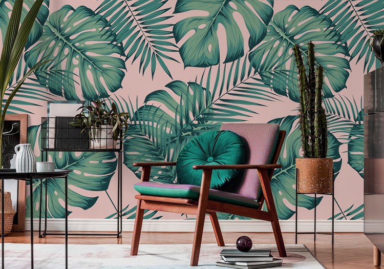 Inspirując się naturą, nie musimy sięgać tylko i wyłącznie po realistyczne motywy przedstawieniowe. Świat aranżacji wnętrz lubi odważne i nietypowe rozwiązania, dlatego jeśli chcemy stworzyć oryginalny wystrój w mieszkaniu, sięgnijmy po fototapety, które wprowadzą wyrazisty kolor do przestrzeni. Tym razem nie będzie mowy o soczystej zieleni, lecz o dość zaskakujących odcieniach w tym kontekście. Specjalista z Myloview wybrał bowiem dla nas wzór, który ukazuje egzotyczne liście na różowym tle. Nie jest to jednak krzykliwy ani neonowy odcień, lecz modna pudrowa tonacja, która prezentuje się bardzo szykownie i elegancko.