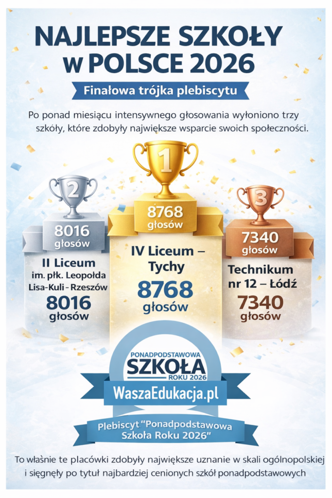 Zakończył się ogólnopolski plebiscyt „Ponadpodstawowa Szkoła Roku 2026”, organizowany przez portal WaszaEdukacja.pl. Tegoroczna edycja cieszyła się ogromnym zainteresowaniem – w głosowaniu wzięli udział uczniowie, rodzice, absolwenci oraz sympatycy szkół z całej Polski, oddając łącznie ponad 158 tysięcy głosów.
