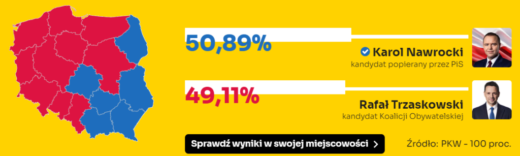 Karol Nawrocki zdobył 50,89% i 10 606 877 głosów a Rafał Trzaskowski 49,11% i 10 237 286 głosów.