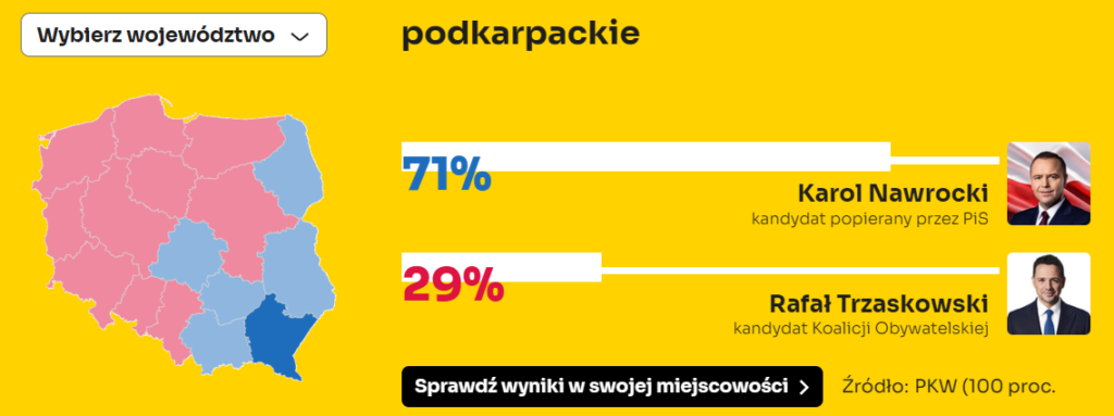 W całym województwie podkarpackim w drugiej turze wyborów prezydenckich zdecydowanie wygrał Karol Nawrocki, który uzyskał 71,02 proc. poparcia. To więcej niż pięć lat temu Andrzej Duda, którego poprało 70,92 proc. głosujących. Ten wynik to potwierdzenie, że Podkarpacie nadal jest “bastionem PiS-u”.