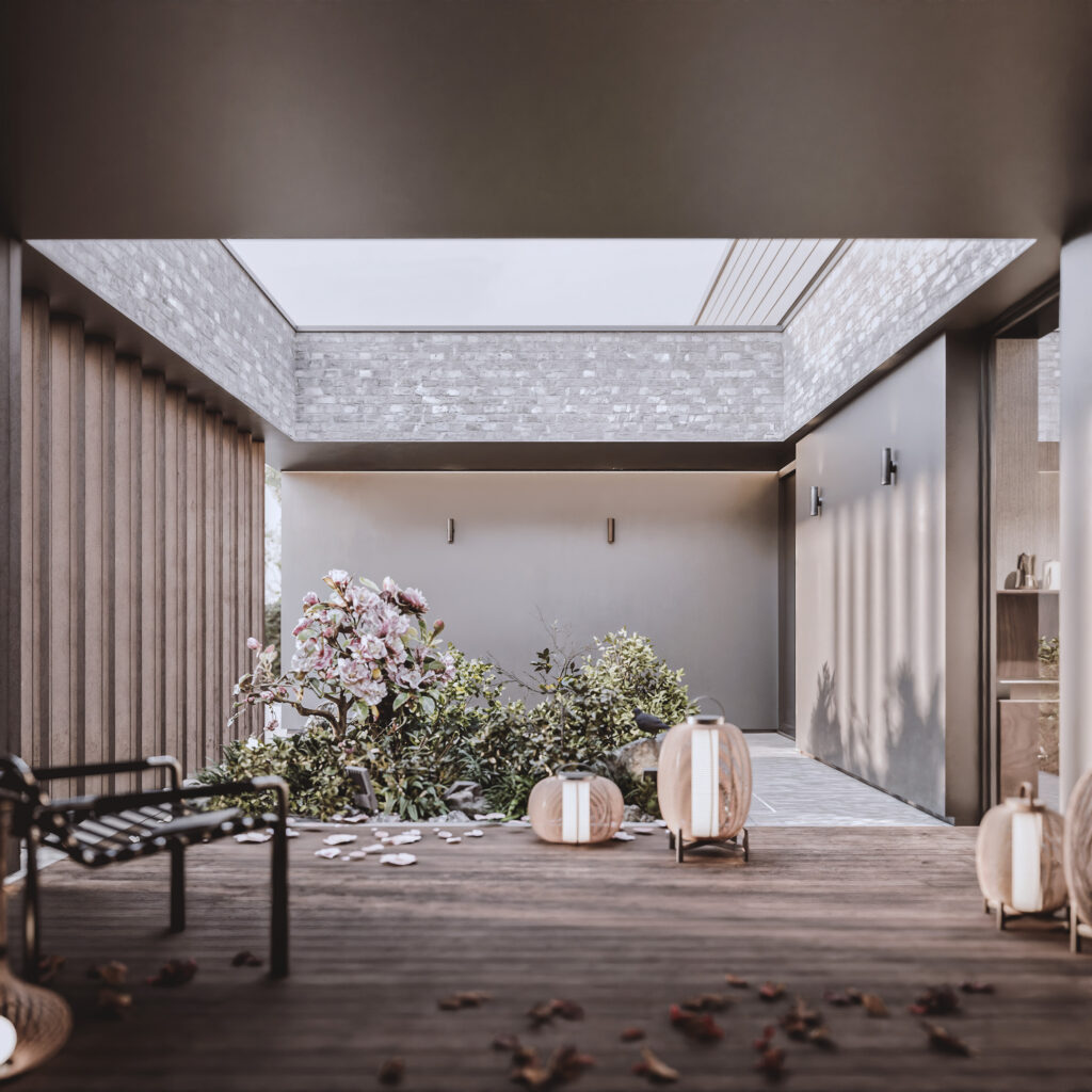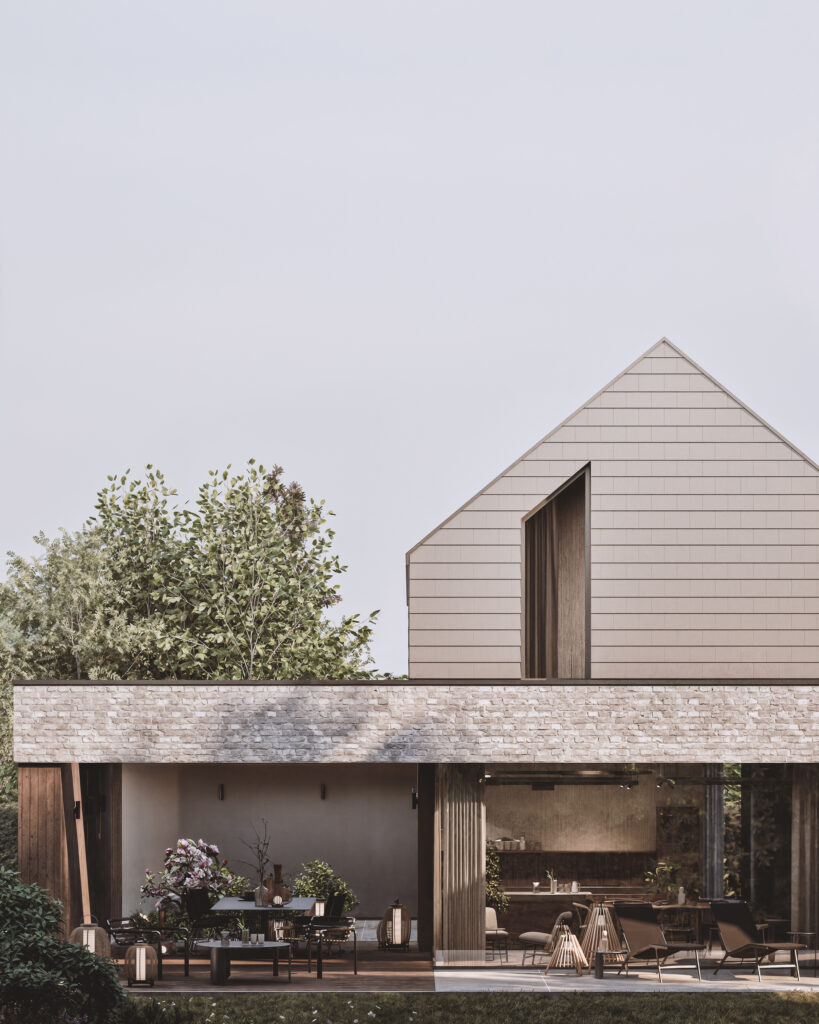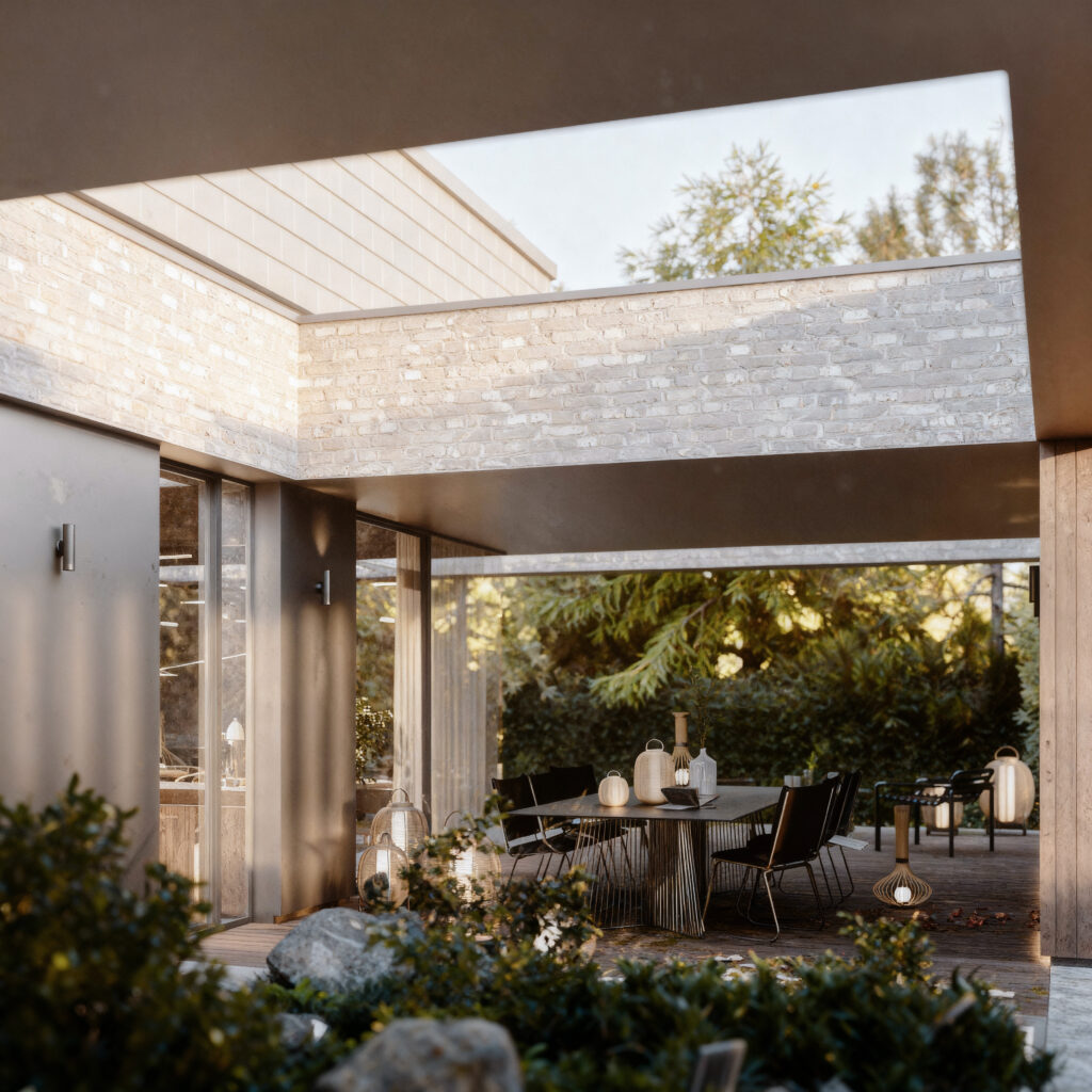 Aby w pełni wykorzystać kierunki padania promieni słonecznych, a przy tym nie otworzyć za bardzo domu na wzrok przechodniów, dom został na ile to możliwe popchnięty w głąb działki. Otwierając tym samym przestrzeń do stworzenia patio będącego miejscem relaksu i wypoczynku. Strefa ta z różnych stron ma zupełnie inny charakter. Od strony ulicy oddzielona jest fragmentarycznie pełną ścianą, a częściowo ażurową konstrukcją w sąsiedztwie wejścia do domu. Z kolei w pozostałych kierunkach otwiera się w pełni na ogród i na dom. Dzięki temu patio tworzy swego rodzaju łącznik domu z ogrodem, a granice między wnętrzami i naturą zaczynają się zacierać.