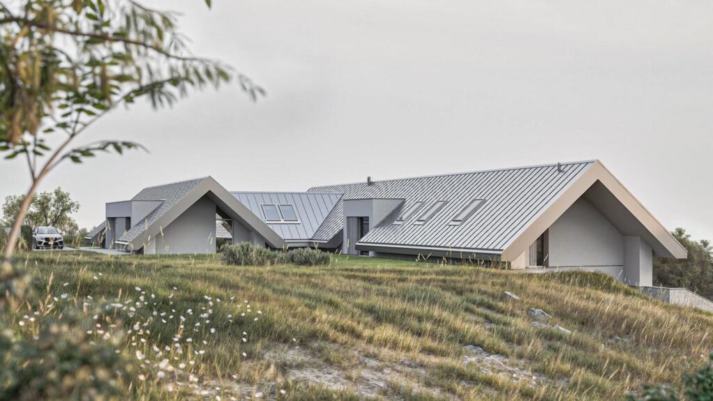 W projekcie zastosowano całą gamę materiałów wykończeniowych o różnych fakturach i odmiennym charakterze, takich jak: blacha dachowa układana na rąbek stojący, obróbki blacharskie, tynk silikonowy, deska elewacyjna, kamień elewacyjny, żwir płukany jako warstwa dociskowa stropodachów lukarn. Każdy z nich jednak w zbliżonym, szarym kolorze. Dzięki temu budynek stanowi jednolitą, monumentalną i spójną w wyrazie całość. Bryła doskonale komponuje się z otoczeniem i dosłownie wyrasta z krajobrazu.