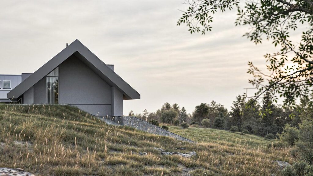 Plan miejscowy zakłada zachowanie panoramy widokowej i minimalizację ingerencji w górzysty krajobraz. W związku z tym częściowo zakamuflowana bryła ukazuje się od frontu jako skromny, introwertyczny, niski, parterowy dom. Dla przechodniów i obserwatorów z zewnątrz – zgodnie z projektowym zamysłem – sprawia wrażenie wręcz niedostępnego. Dla domowników i ich gości odsłania swoje zupełnie inne, tym razem w pełni ekstrawertyczne, najokazalsze oblicze, otwarte na naturę, okolicę i widoki, oferując bogaty program funkcjonalny.